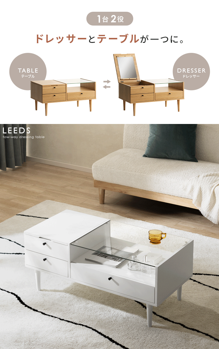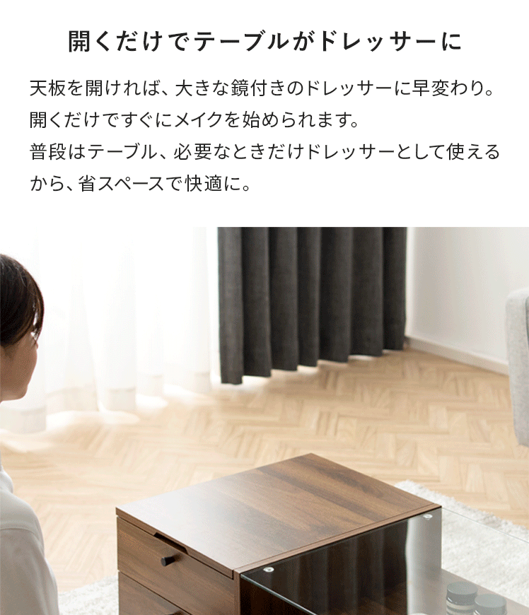 | 耐荷重 | 開閉天板/5kg、ガラス天板/3kg、各引出し/3kg、ガラス下棚/5kg、引出し奥収納/3kg |