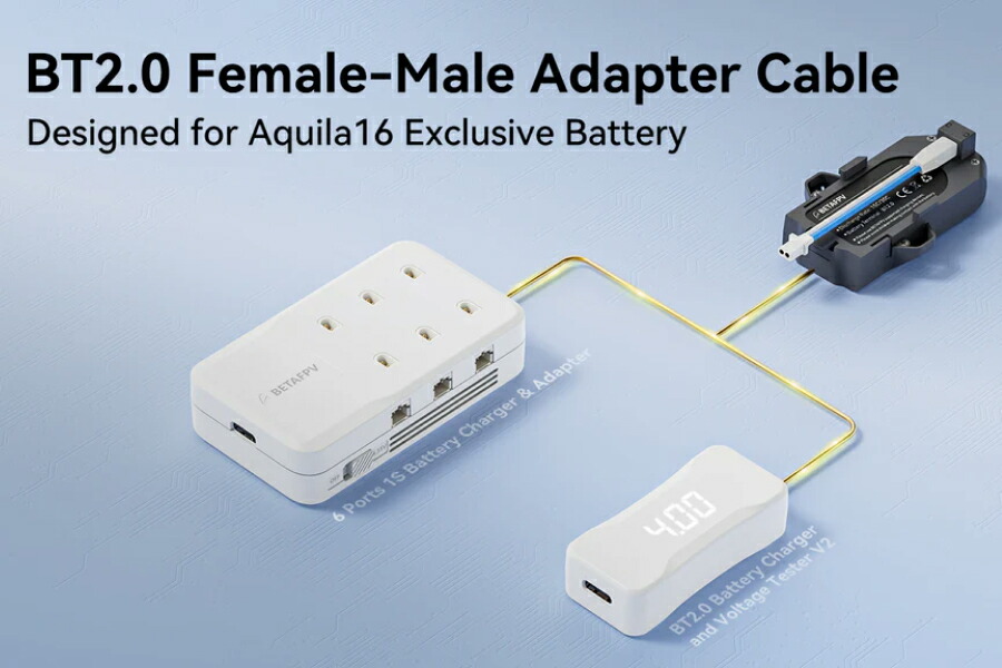 専用メス-オスアダプターケーブルAquila16 FPVキットAquila16パイロットに強くお勧めするアクセサリーです。キットに含まれる充電アダプターケーブルは2本のみなので、過度な充電需要を満たすのは困難です。しかし、このアダプターケーブルがあれば、Aquila16専用バッテリーをACアダプターから直接充電できるので、非常に便利です。6ポート1Sバッテリー充電器&アダプターまたはBT2.0 バッテリー充電器および電圧テスター V2これにより、充電効率が向上し、時間とスペースを節約し、操作を簡素化し、管理が容易になります。Aquila16の初心者の飛行体験を向上させるために、この必須アクセサリをお見逃しなく。