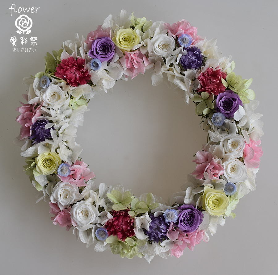 プリザーブドフラワーリース 白・紫・淡い緑のバラ アジサイ ギフト プレゼント 誕生日
