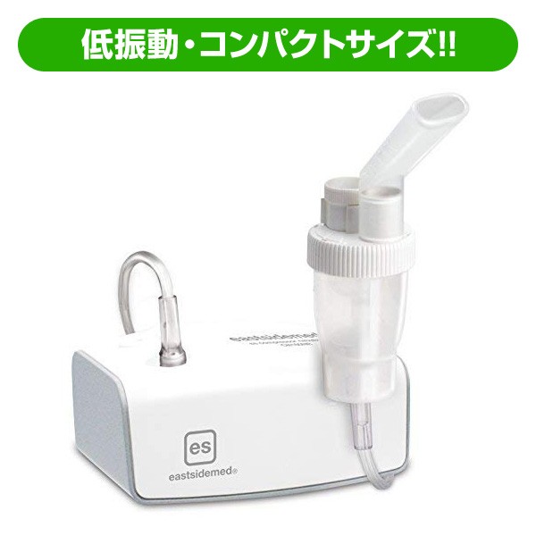 両手に収まるコンパクトなコンプレッサー式ネブライザ 非常に静かな動作音で、気になる夜の使用も安心