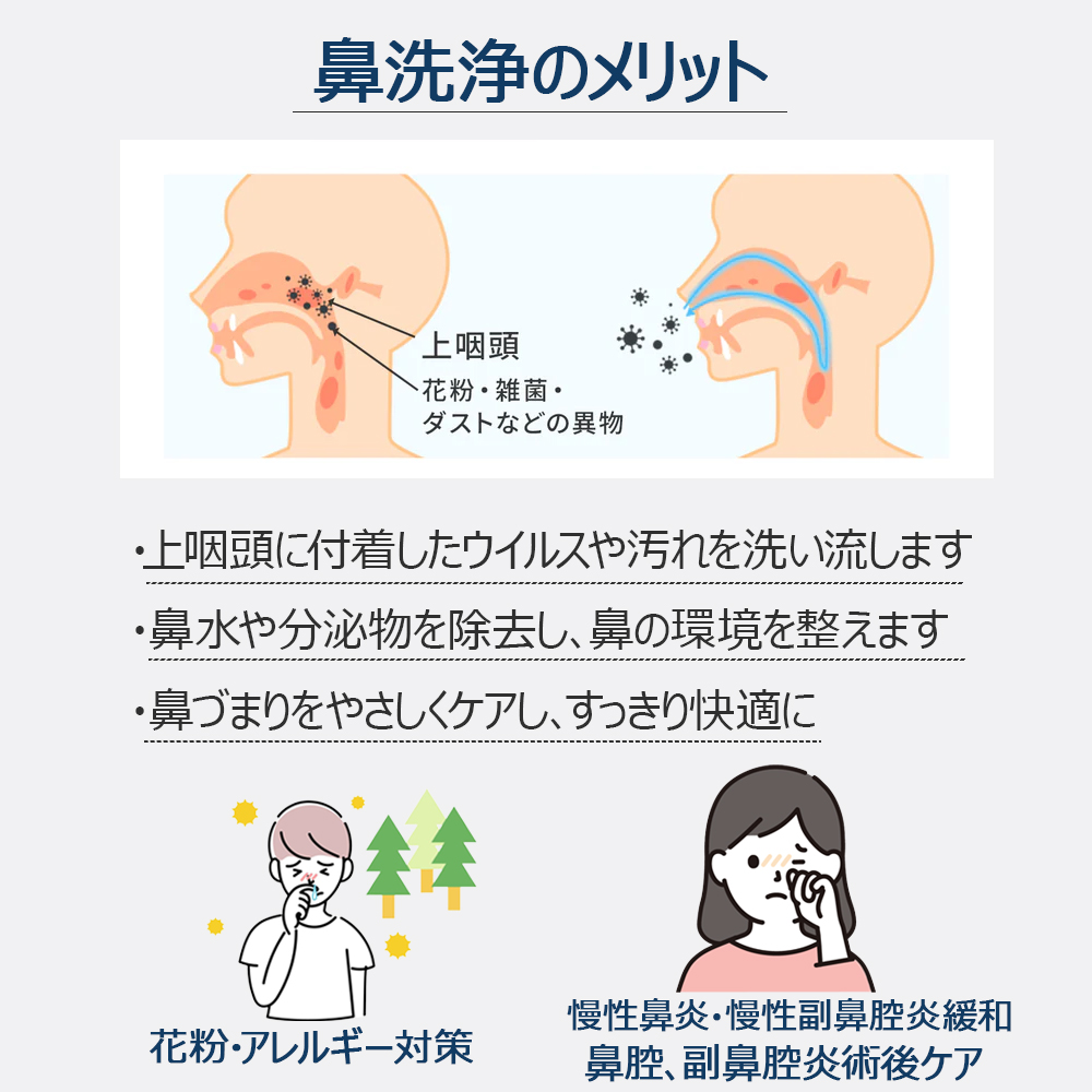 鼻腔および副鼻腔の術後ケアまで、幅広い症状に対応します。鼻腔全体に洗浄液がしっかり届き、高い洗浄力を発揮します。