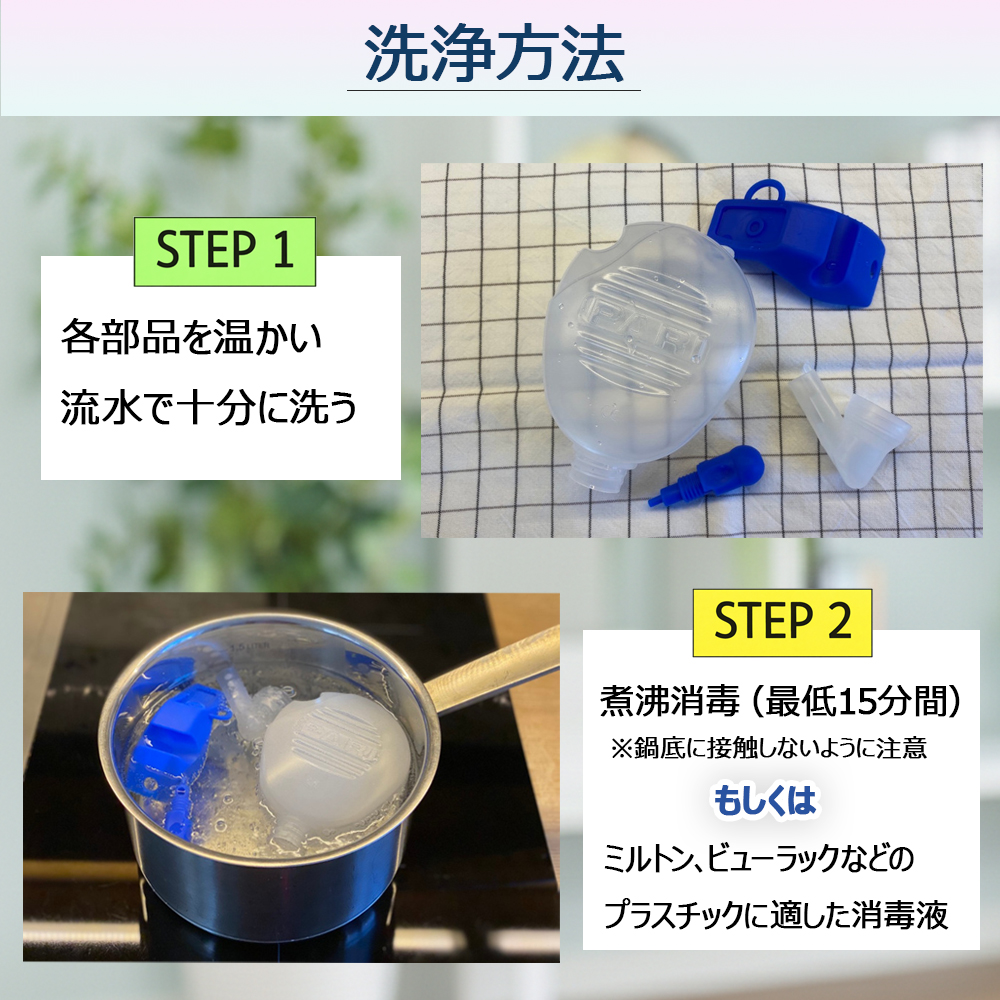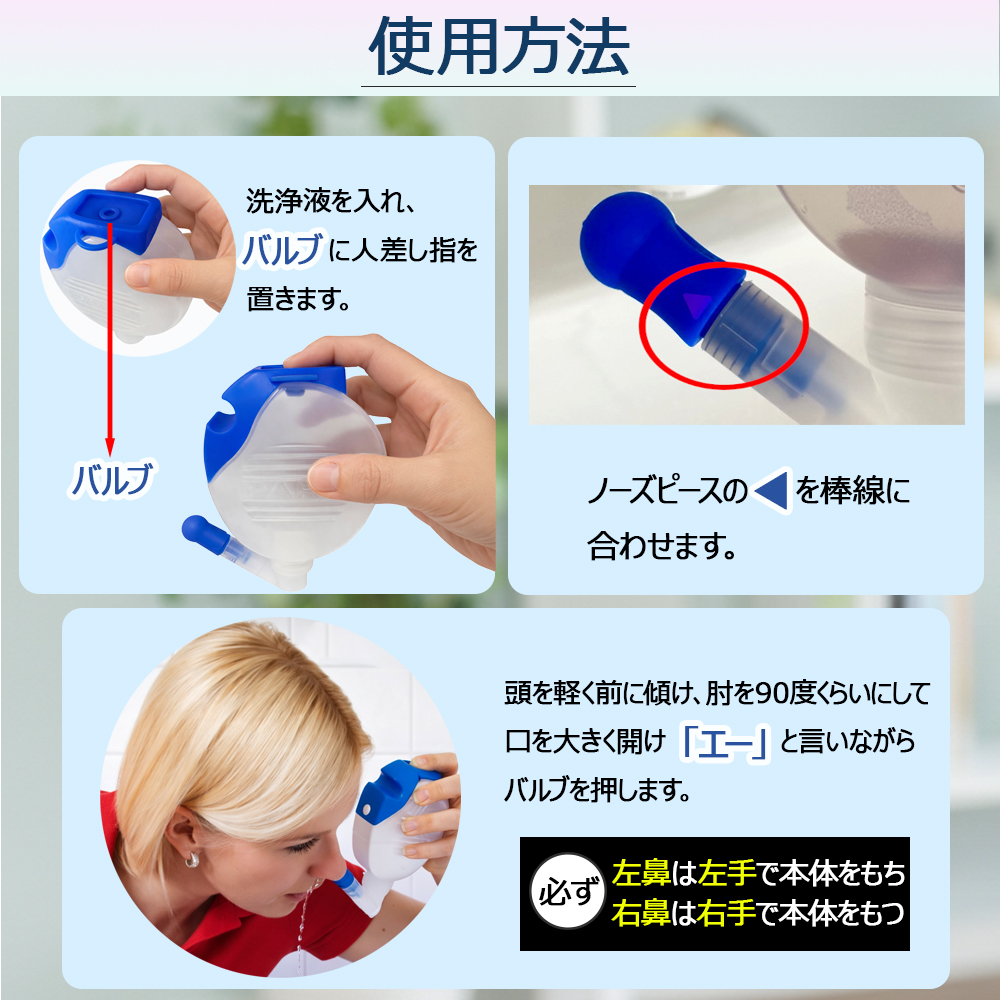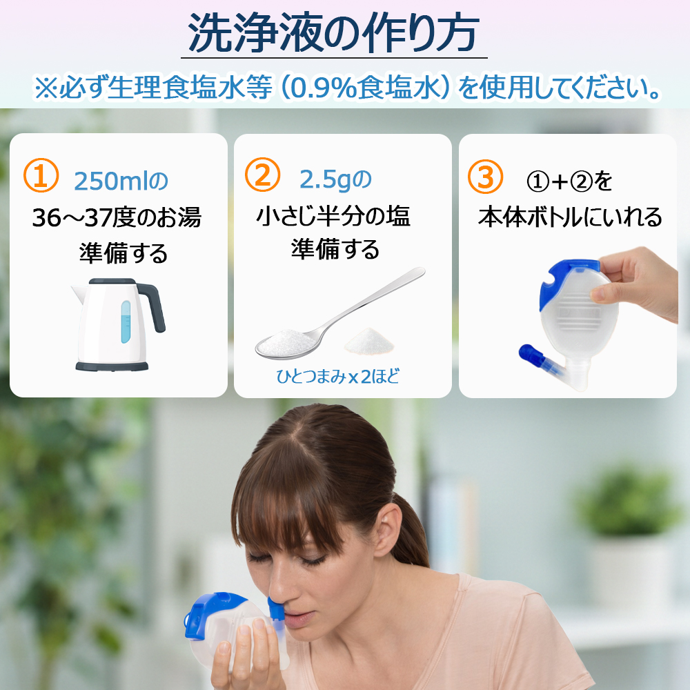 ※鼻洗浄液は、必ず生理食塩水等(0.9%食塩水)を使用してください。