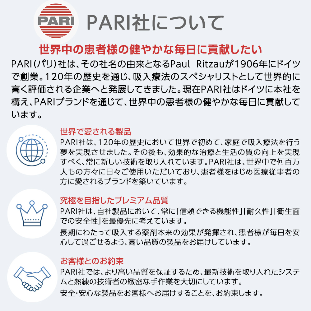 PARIは110年以上にわたり吸入療法分野で信頼されてきたブランドであり、高品質な医療機器と関連製品の専門メーカーとして世界的に認められています。