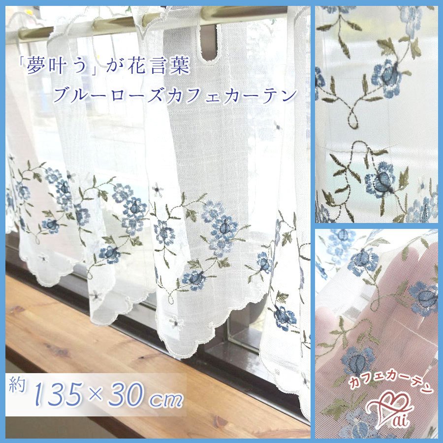 ai カフェカーテン ポスト投函で送料無料 ブルーローズ 縦30cm ベリーショート 花言葉 夢叶う 半透明オフホワイト生地に淡いブルーローズ刺繍 LC