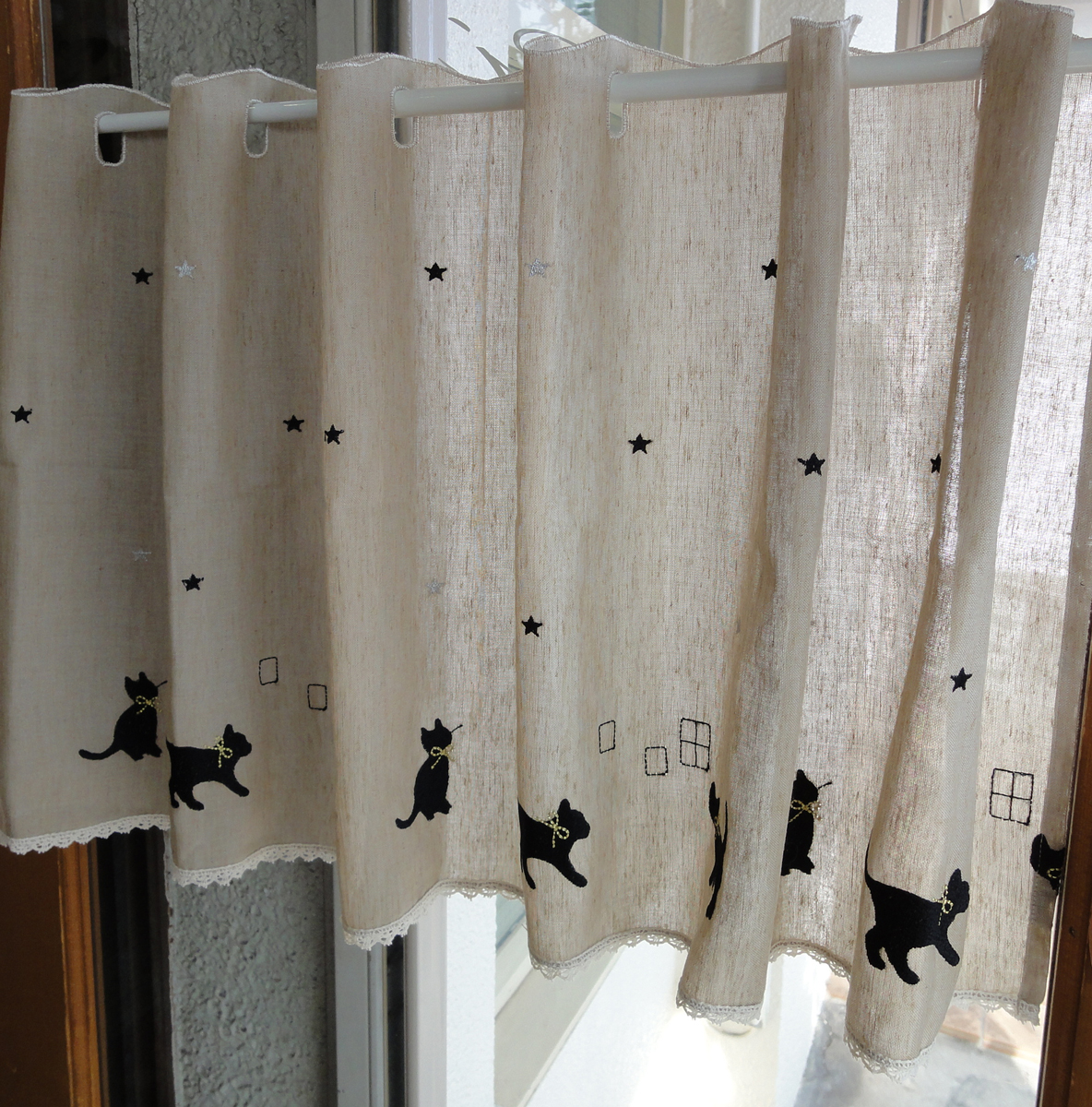 ai カフェカーテン 横115x縦45 ポスト投函で送料無料 レースタイプができました ネコと暮らす ショート ねこ 黒猫 自然な白 ネコ猫雑貨 目隠し 小窓にも 北