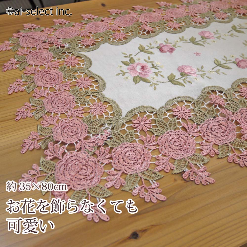 New お花を飾らなくても可愛い テーブルセンター ランナー 約35×80cm 薔薇 レース 刺繍 ピンク ギフト 新築祝い 北欧 テーブルコーディネート tw