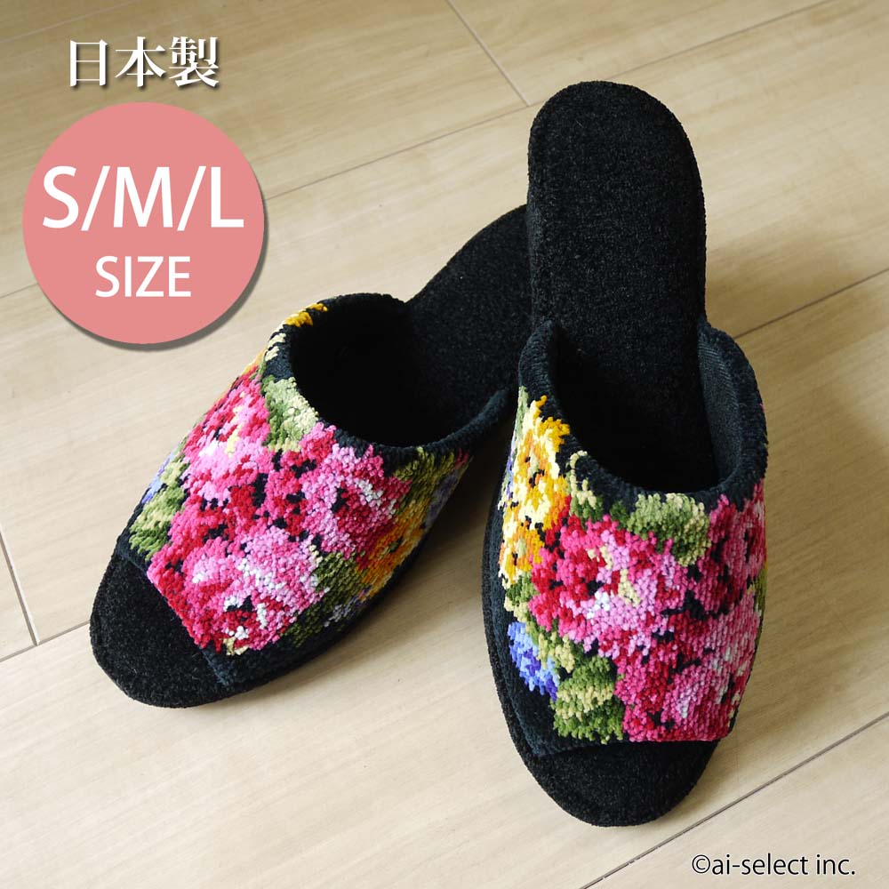 ヒールスリッパ 4cm 日本製 室内 シャンティ Mサイズ 小柄な方もキッチン作業が楽 ai ブラック 黒 シェニール織 薔薇 ギフト おしゃれ 可愛い mom
