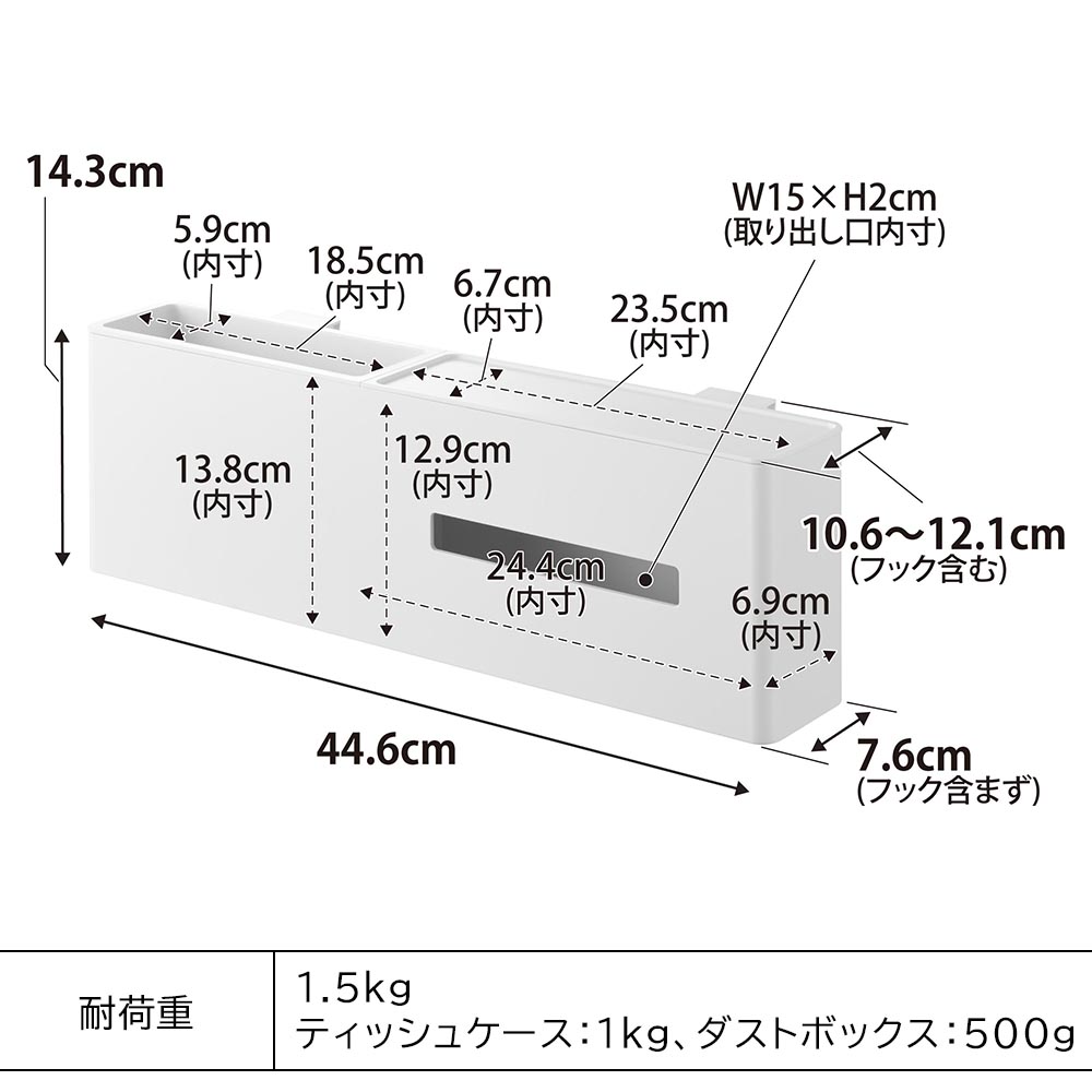 | 耐荷重 1.5kg ティッシュケース:1kg ダストボックス:500g (静止荷重) |