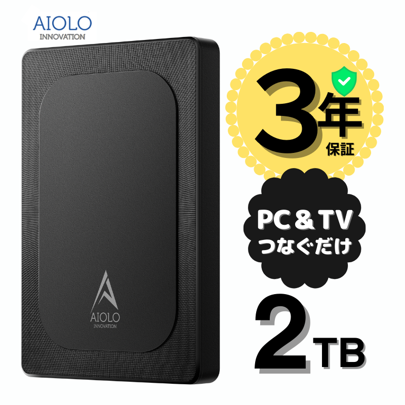 外付けハードディスク ポータブル テレビ録画 PC PS4 PS5 xbox対応 静音 超薄型 耐衝撃 2TB 3年保証 USBケーブル アダプタ付 USB3.2 電源不要 A4-2T-BLK-A