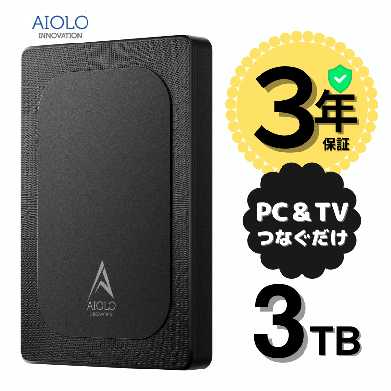 外付けハードディスク ポータブル テレビ録画 PC PS4 PS5 xbox対応 静音 超薄型 耐衝撃 3TB 3年保証 USBケーブル アダプタ付 USB3.2 電源不要 A4-3T-BLK-A