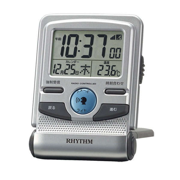 音声で時間をお知らせ/リズム時計 電波デジタル目覚まし時計 トラベルクロック/フィットウェーブD214 電子音 音声/シルバーメタリック 8RZ214SR19