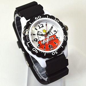 アウトドアやプール遊びにもOK!10気圧防水+逆回転防止レジスタリング付きの本格派ウォッチ。スポーツウォッチのスタイリッシュなフォルムに文字板にはスヌーピーのイラスト。