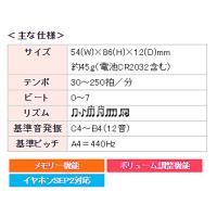 ブラスバンド、オーケストラ等ジャンルを問わず、あらゆる楽器の初心者から中・上級者の日々の練習に必要な機能を、携帯に便利なカードサイズに凝縮した、楽器奏者必携のデジタルメトロノームです。