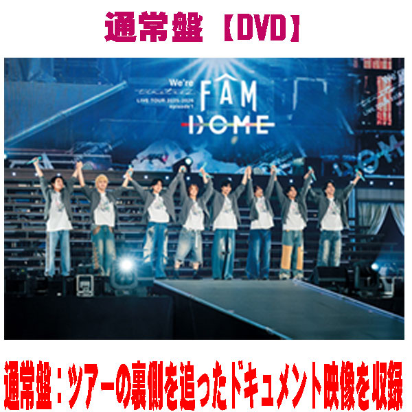 | [DVD] 【Disc1】 「We’re timelesz LIVE TOUR 2025-2026 episode1 FAM DOME@東京ドーム」ライブ本編(初回限定盤・通常盤 共通) 【Disc2】 ・Document Movie of We’re timelesz LIVE TOUR 2025 episode 1 〜FAM〜→ FAM DOME ⇒新体制初となるアリーナ→ドームツアーの裏側を追ったドキュメント映像を大ボリュームで収録! 【Disc3】 詳細後日発表 |