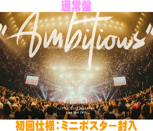 | [DVD] ◆Little Glee Monster Live Tour 2025 “Ambitious” - 2025.07.21 1. 雲の感触 2. Break out of your bubble 3. Memories 4. スペシャルメドレー Ambitious ver. (I Feel The Light 〜 ダイヤモンド 〜 Hop Step Jump! 〜 Get Down 〜 Never ending dreamer 〜 Ready to go 〜 WONDER LOVER 〜 Waves) 5. Gravity 6. Play the Game 7. PLANET 8. いつかこの涙が 9. 夏になって歌え 10. 永遠に 11. Run 12. 世界はあなたに笑いかけている 13. Join Us! 14. SAY!!! 〜 MASTER KEY 15. 夢じゃないならなんなのさ 16. ECHO 17. For Decades <ENCORE> 18. For Decades 19. 晴れの舞台 |