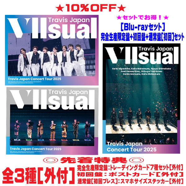 | ★完全生産限定盤 [Blu-ray] ★DISC-1(全形態共通) ◆Travis Japan Concert Tour 2025 VIIsual ※2025年1月6日実施 横浜アリーナ公演を収録(6人) ★DISC-2 ◆特典映像A ※詳細後日発表 ★初回盤 [Blu-ray] ★DISC-1(全形態共通) ◆Travis Japan Concert Tour 2025 VIIsual ※2025年1月6日実施 横浜アリーナ公演を収録(6人) ★DISC-2 ◆特典映像B ※詳細後日発表 ★通常盤 [Blu-ray] ★DISC-1(全形態共通) ◆Travis Japan Concert Tour 2025 VIIsual ※2025年1月6日実施 横浜アリーナ公演を収録(6人) ★DISC-2 ◆特典映像C ※詳細後日発表 |