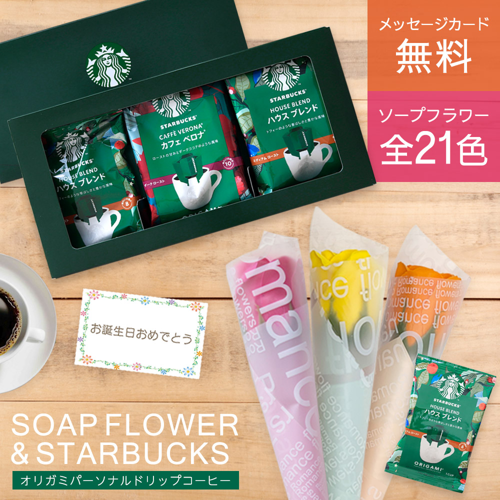 香りと彩りに癒されるソープフラワーと、人気カフェ「スターバックスコーヒー」のドリップコーヒーのギフトセットです。