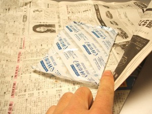 保冷剤はそのまま入れると水滴が付いてしまいますので、新聞紙でくるんで水滴が直接タケノコに付かないようにしています。