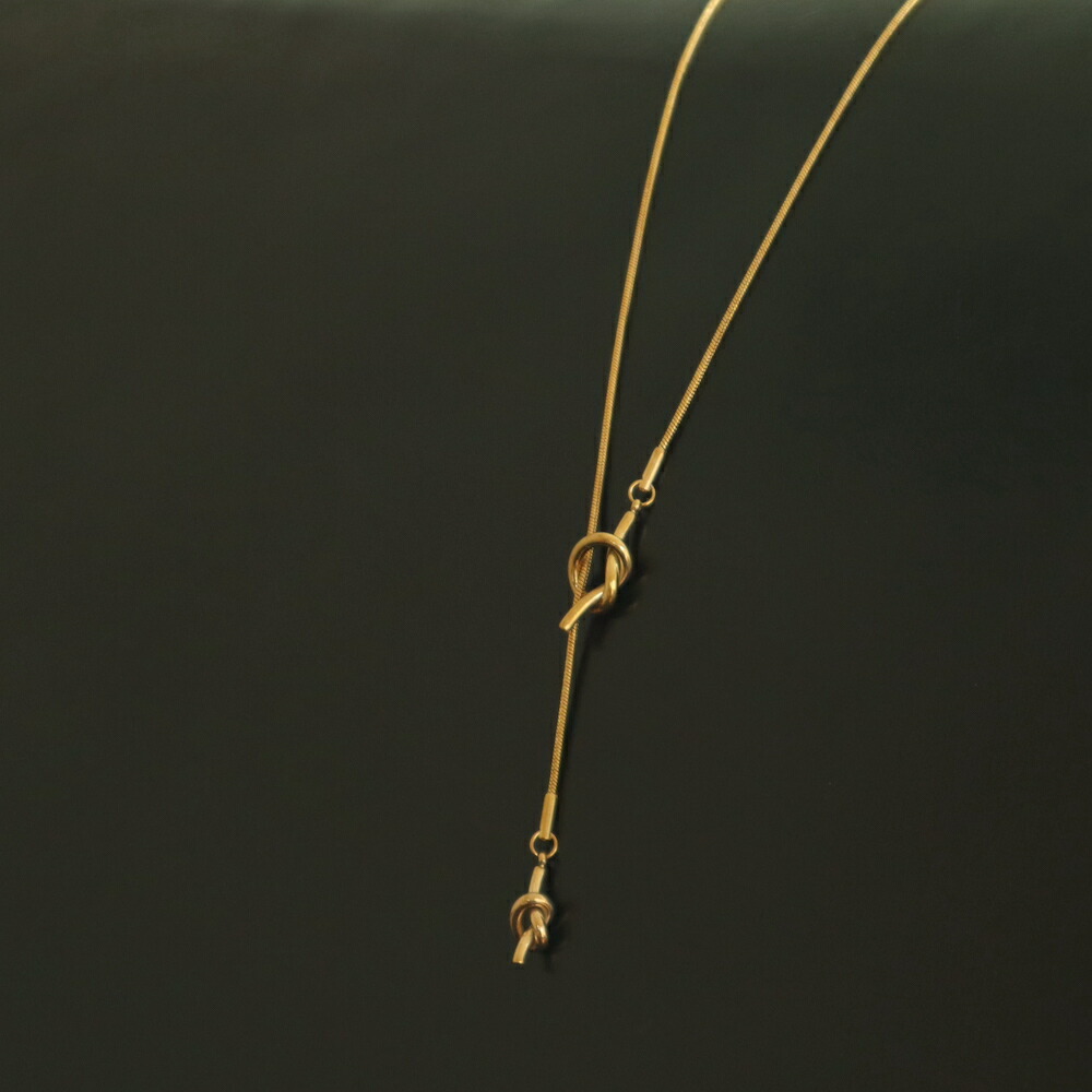 | サイズ | 全長約65cm ※結び目ペンダントを動かすことによって調節可能 上結び目ペンダント幅8mm(最大部) 下結び目ペンダント幅5.7mm(最大部) チェーン幅1.2mm |