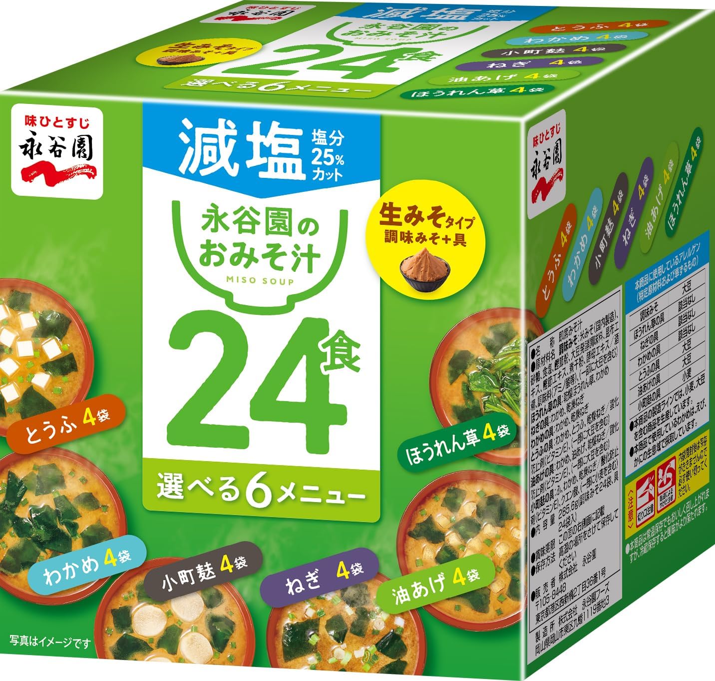 ・バラエティー感のある人気の4メニューのアソートみそ汁(24食入)。「箱入り生みそタイプ徳用24食みそ汁」に比べ、塩分25%カットの減塩タイプ。