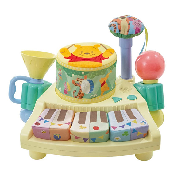 6つの楽器でかんたん演奏ができる、くまのプーさんの、布のやわらか楽器セットです。