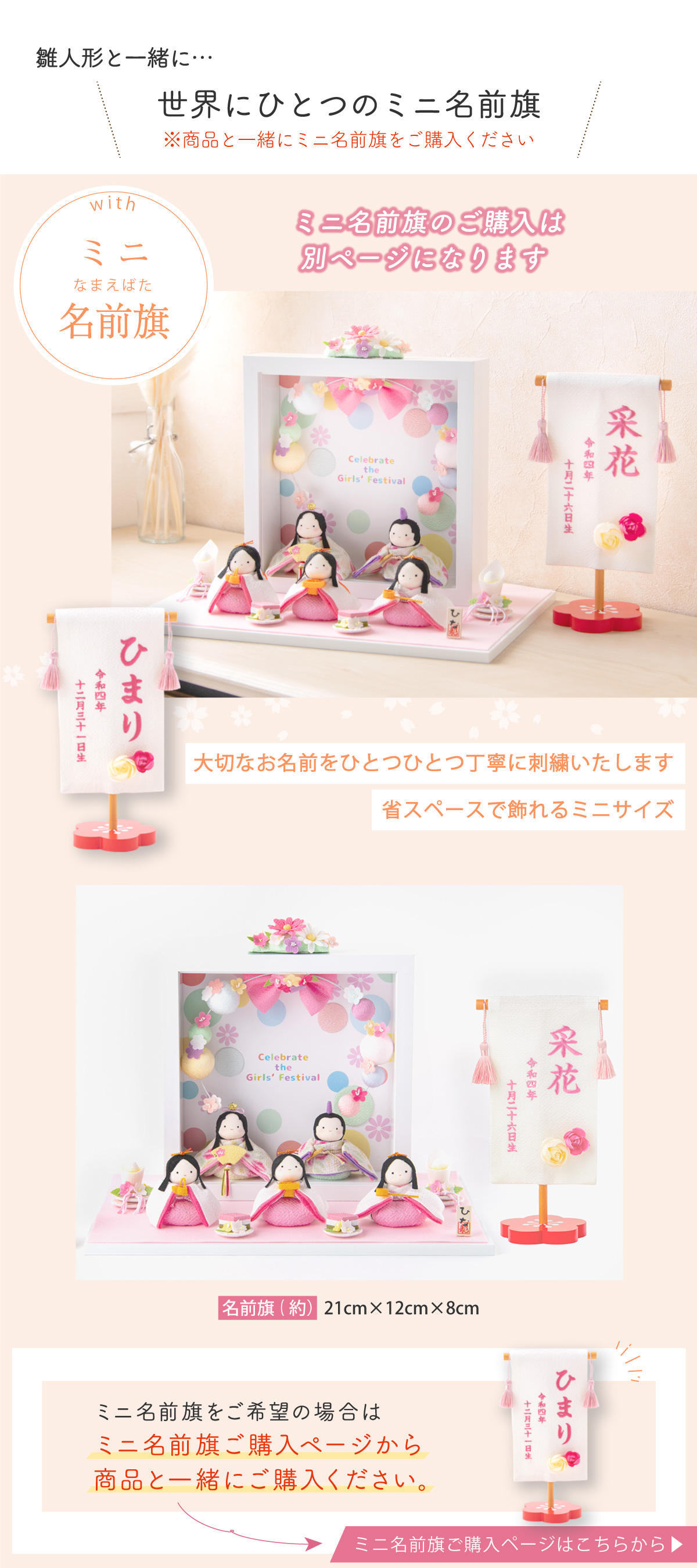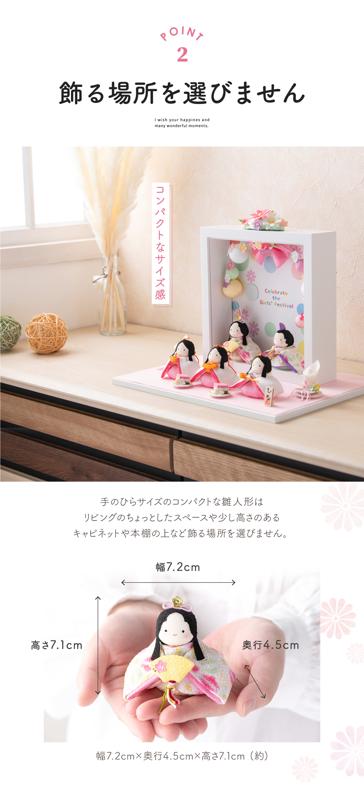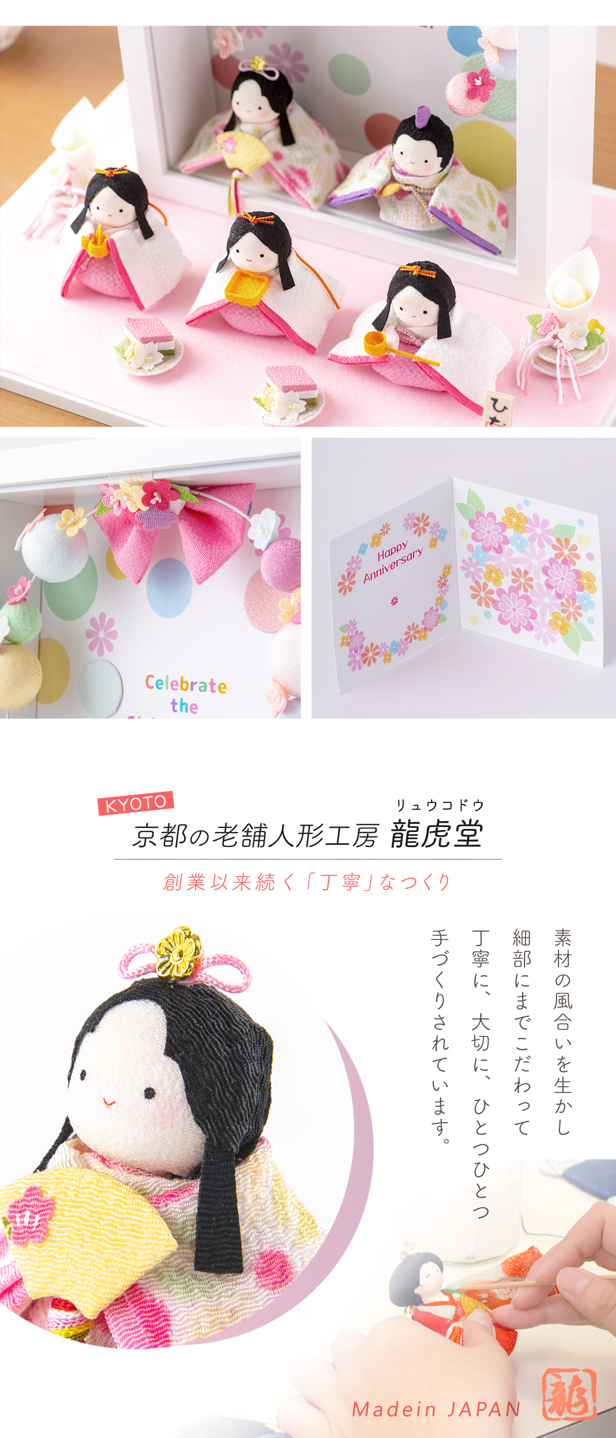古の習わしと現代の雛祭りを融合し、お子さまのお部屋にお飾りいただく、季節を演出するインテリア、お店などのディスプレイや恋人への沢山の思いを込めたプレゼントなど、多くのシーンで大活躍します。