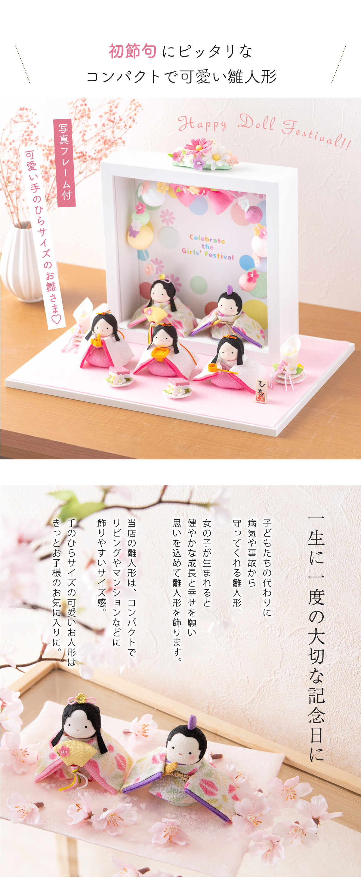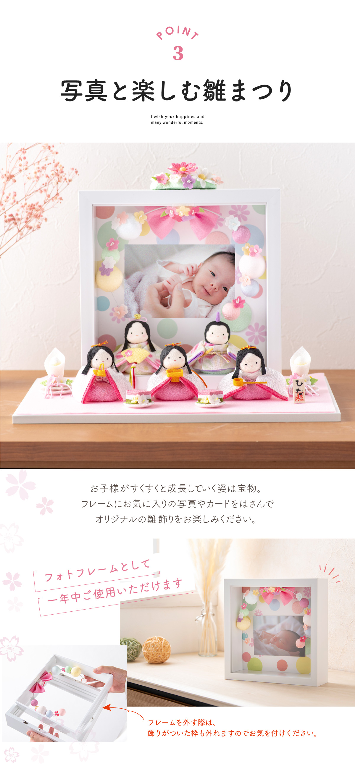 商品特徴:写真と一緒に楽しむひなまつり。お子様がすくすくと成長していく姿はご家族にとっても宝物。毎年写真を変えてアレンジしたりしてあなただけの雛飾りを楽しめます。