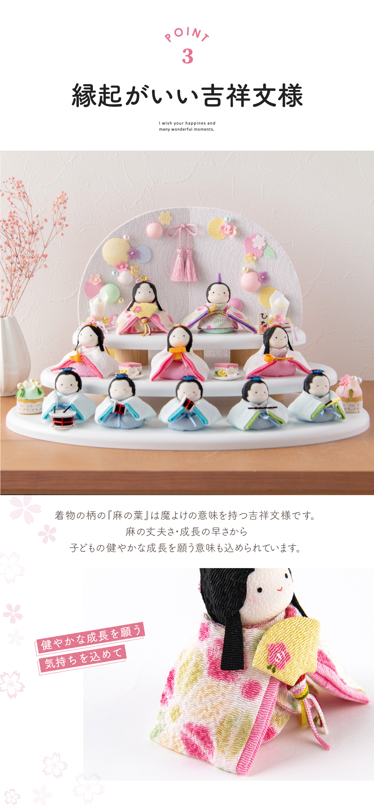 ◆雛人形 ひな人形 おひなさま お雛様 かわいい コンパクト おしゃれ【ぽてりひな 10人(麻の葉)木製台飾りセット】 ◆