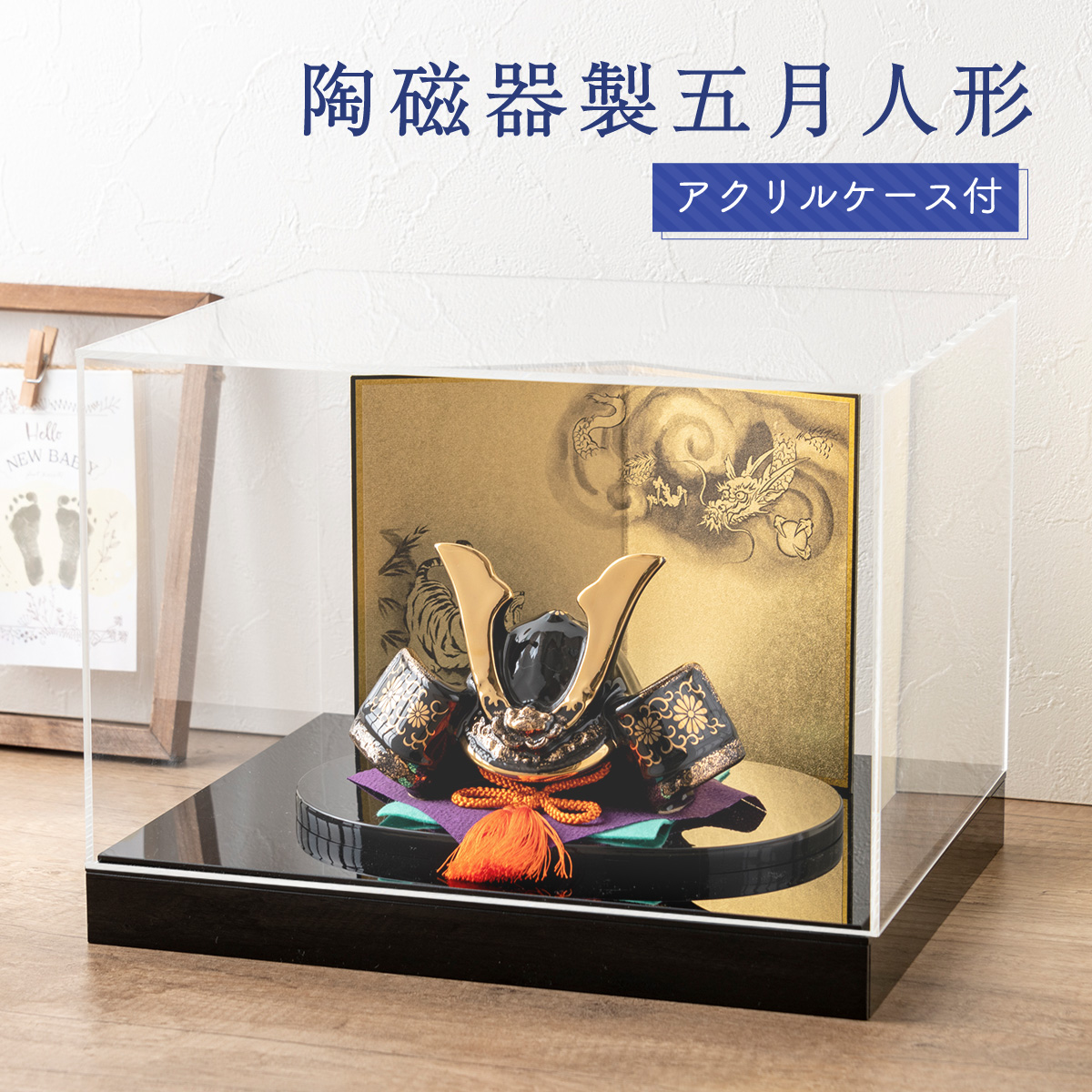 ●新作 五月人形 コンパクト おしゃれ 兜 兜飾り こどもの日 子供の日 2024年 節句飾り 節句人形 陶器 陶磁器 金彩出世兜(菊唐草・龍虎屏風付)アクリルケース付き