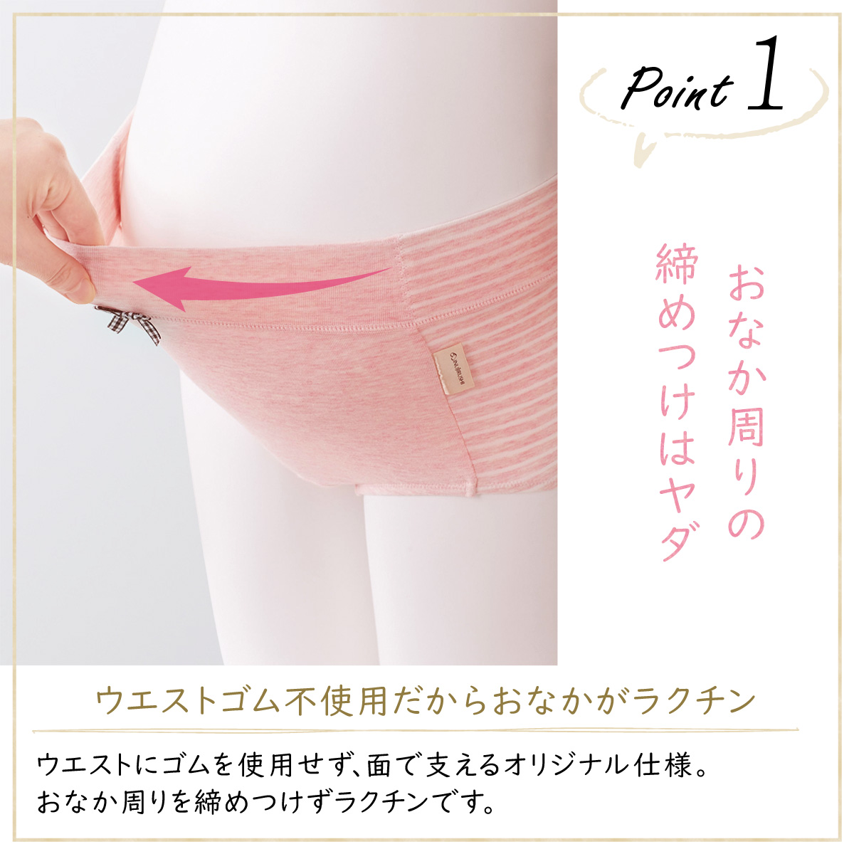 ・アンダーにゴムを使用せず、伸縮性のある生地で幅広の2重仕様にすることで、締めつけ感なく、ほどよくフィット。