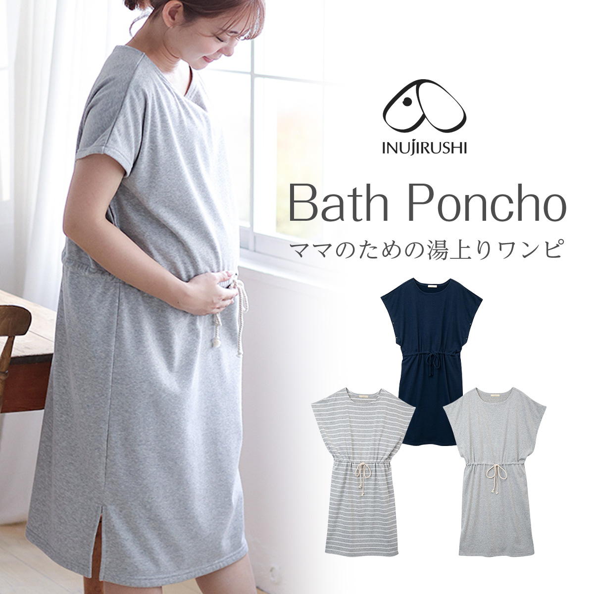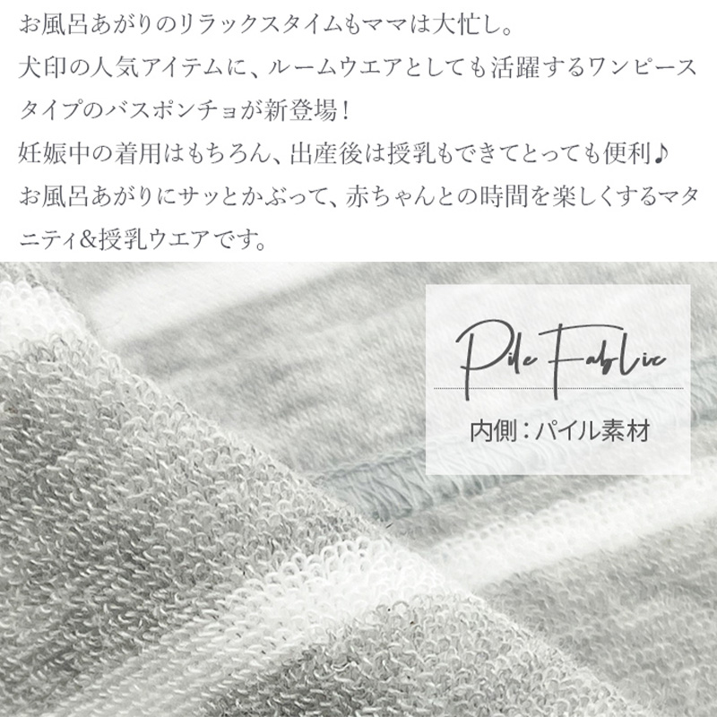 マタニティ 妊婦 犬印 犬印本舗 産前産後 マタニティウェア ワンピース 半袖 ひざ丈 春 夏 ママのための湯上りポンチョ ルームウェア 入浴 授乳 ルームウェア かわいい おしゃれ シンプル 部屋着 早着替え マタニティM〜L ネイビー/グレー/グレーボーダー
