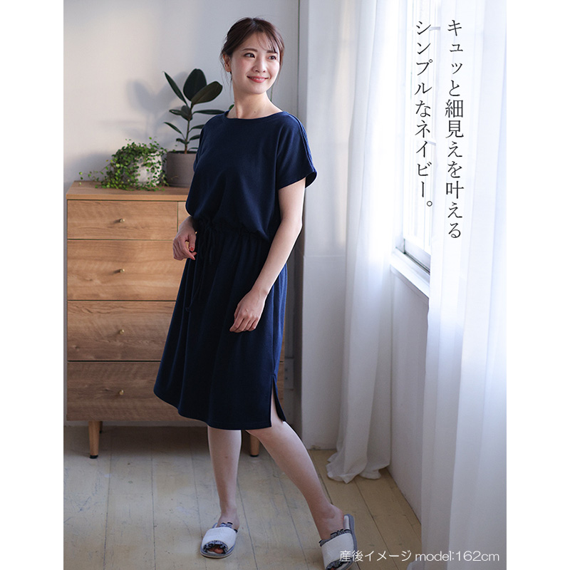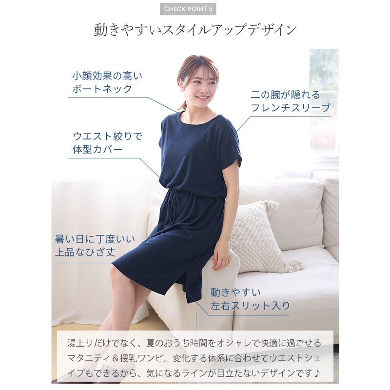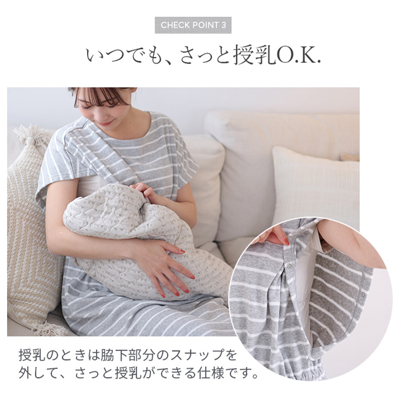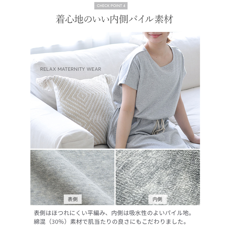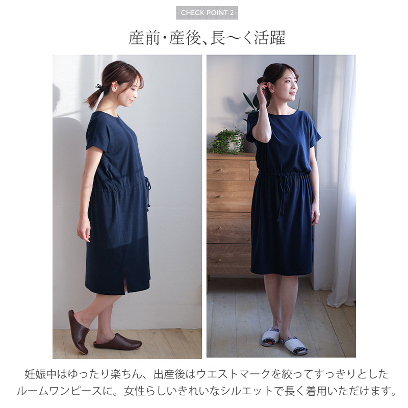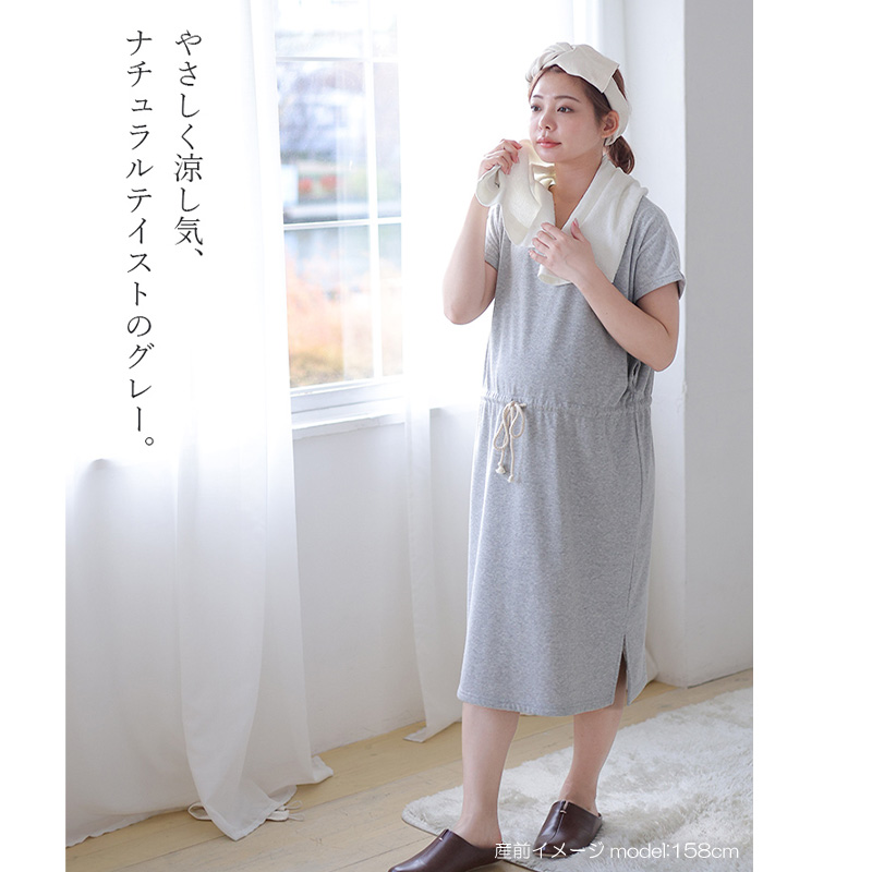 お風呂上りにさっとかぶって使える便利なバスポンチョとして使用しても良いし、ルームワンピースとしても着用できる1枚2役できるママ想いのマタニティウェアです。