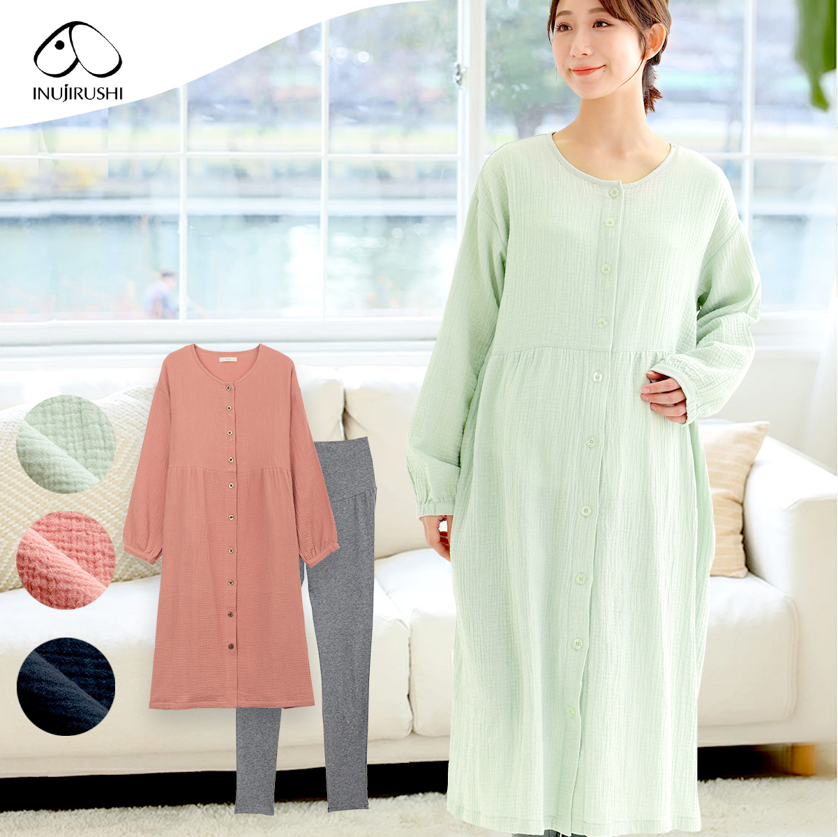 マタニティ パジャマ 長袖 犬印本舗 ぽこぽこガーゼ 丸首パジャマ 出産準備 出産入院 長め丈 授乳 おしゃれ ルームウェア マタニティパジャマ 妊婦 コットン 肌に優しい ダブルガーゼ ガーゼパジャマ 上下セット 夏 ML モスグリーン ローズピンク ネイビー