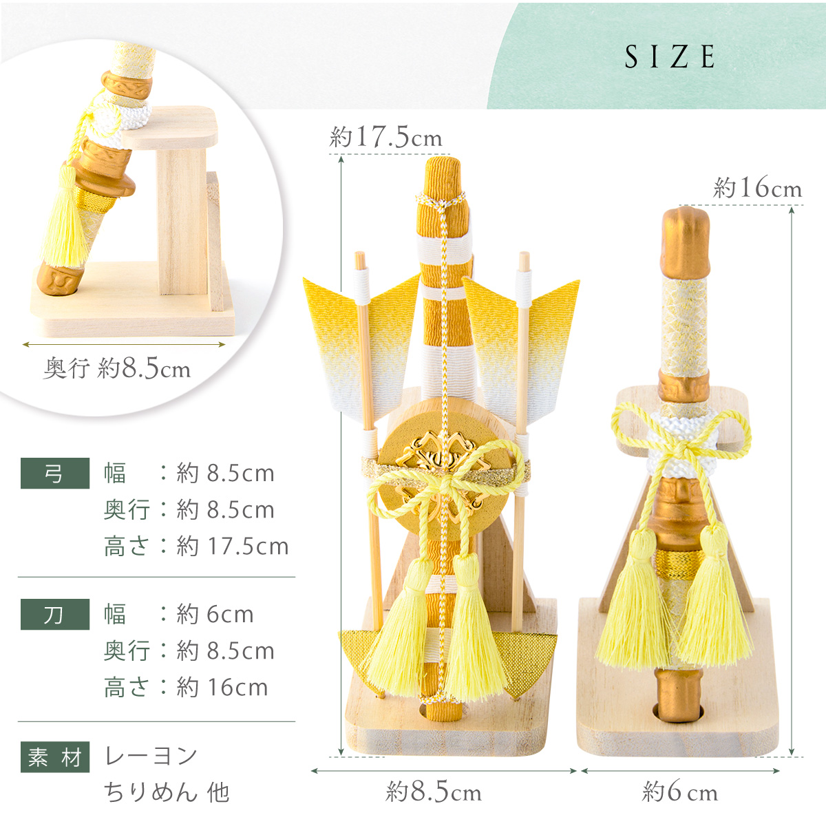 弓 サイズ(cm):約 幅8.5/奥行8.5/高さ17.5、刀 サイズ(cm):約 幅6/奥行8.5/高さ16