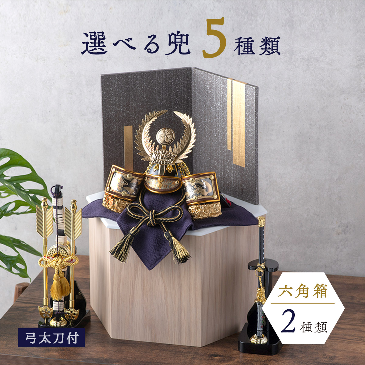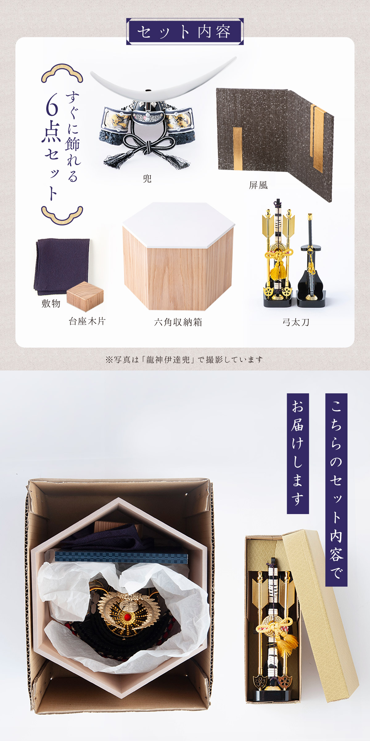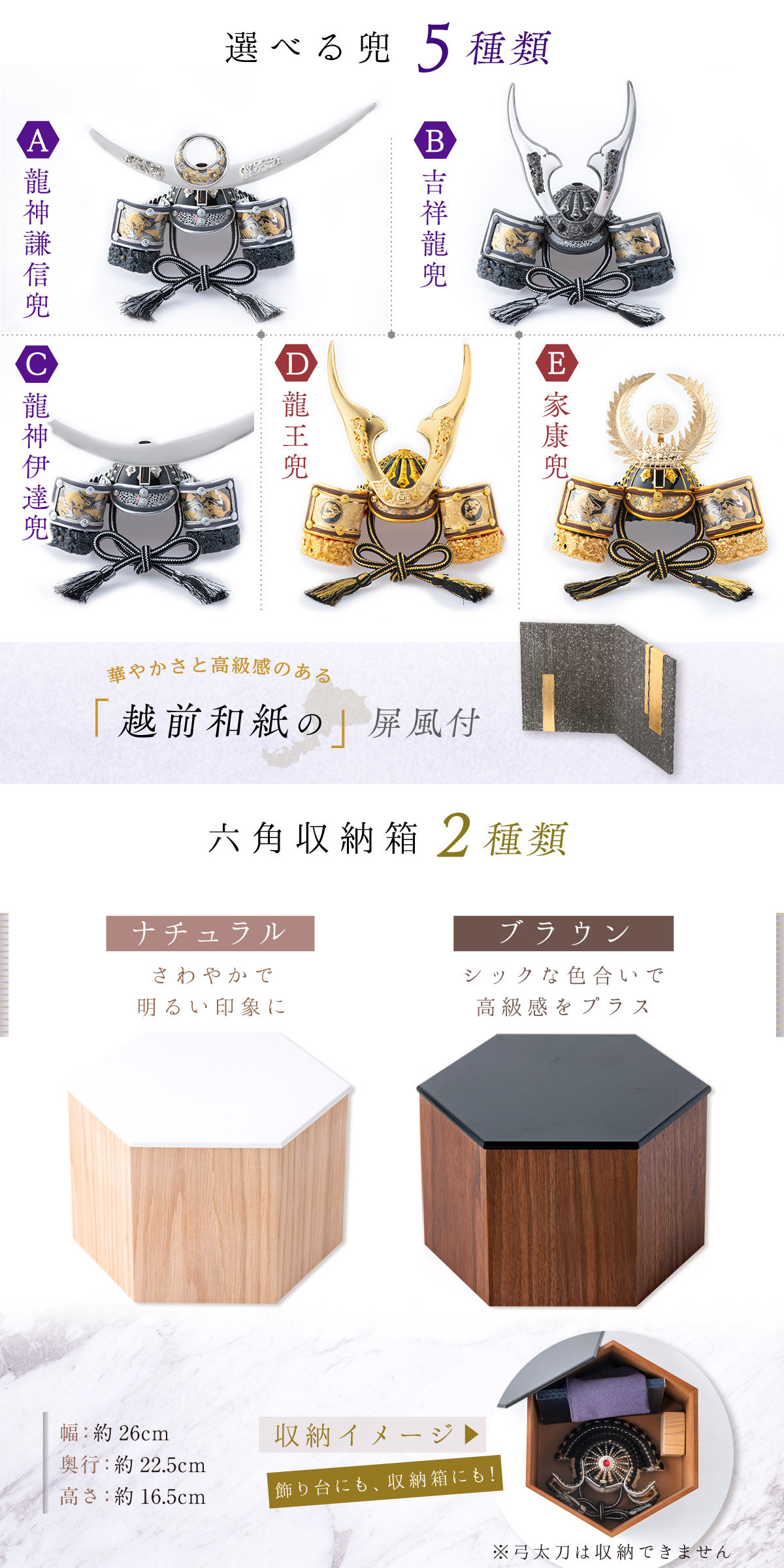 付属:兜・六角収納箱【意匠登録出願済】・屏風・敷物・土台木片・弓太刀
