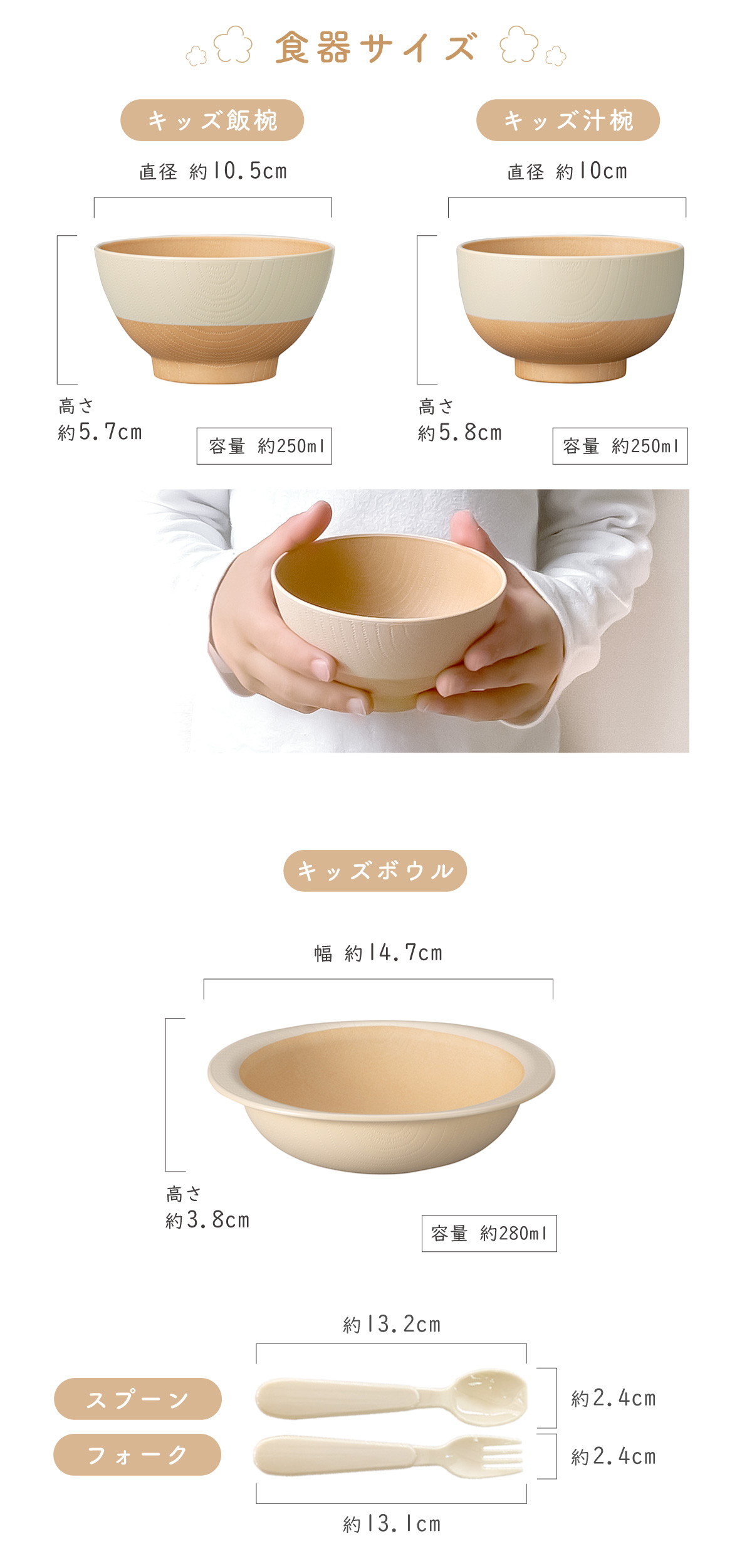 ■サイズ(cm):飯椀(直径10.5×高さ5.7),汁椀(直径10×高さ5.8),ボウル(幅14.7×高さ3.8),スプーン/フォーク(長さ13.1)