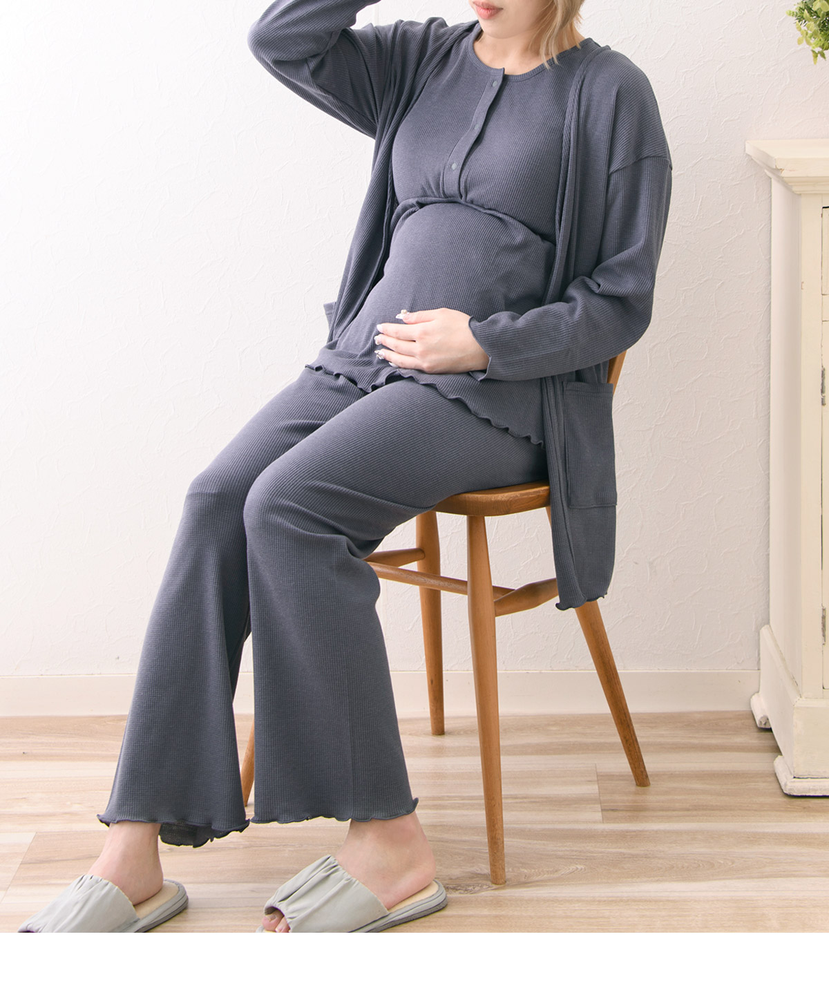 カーディガン・タンクトップ・ボトムが揃った便利なマタニティルームウェア。