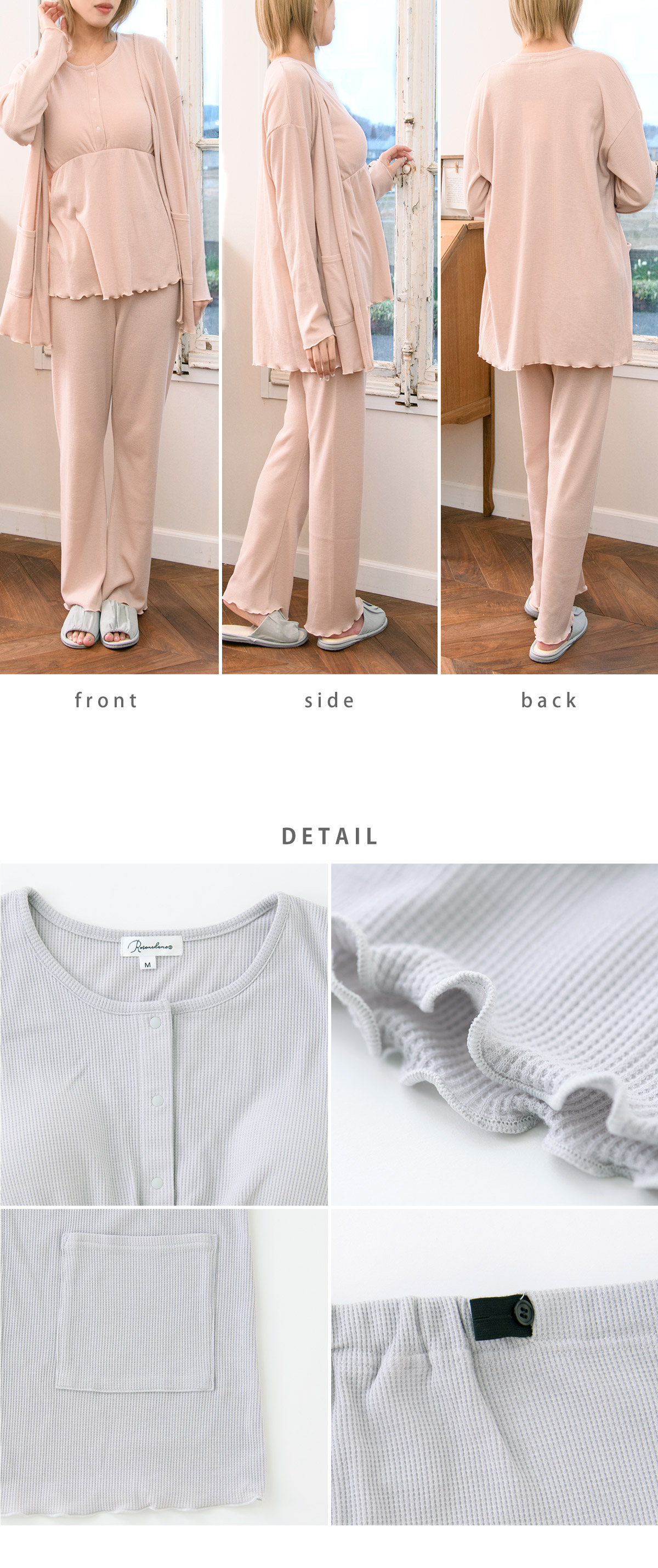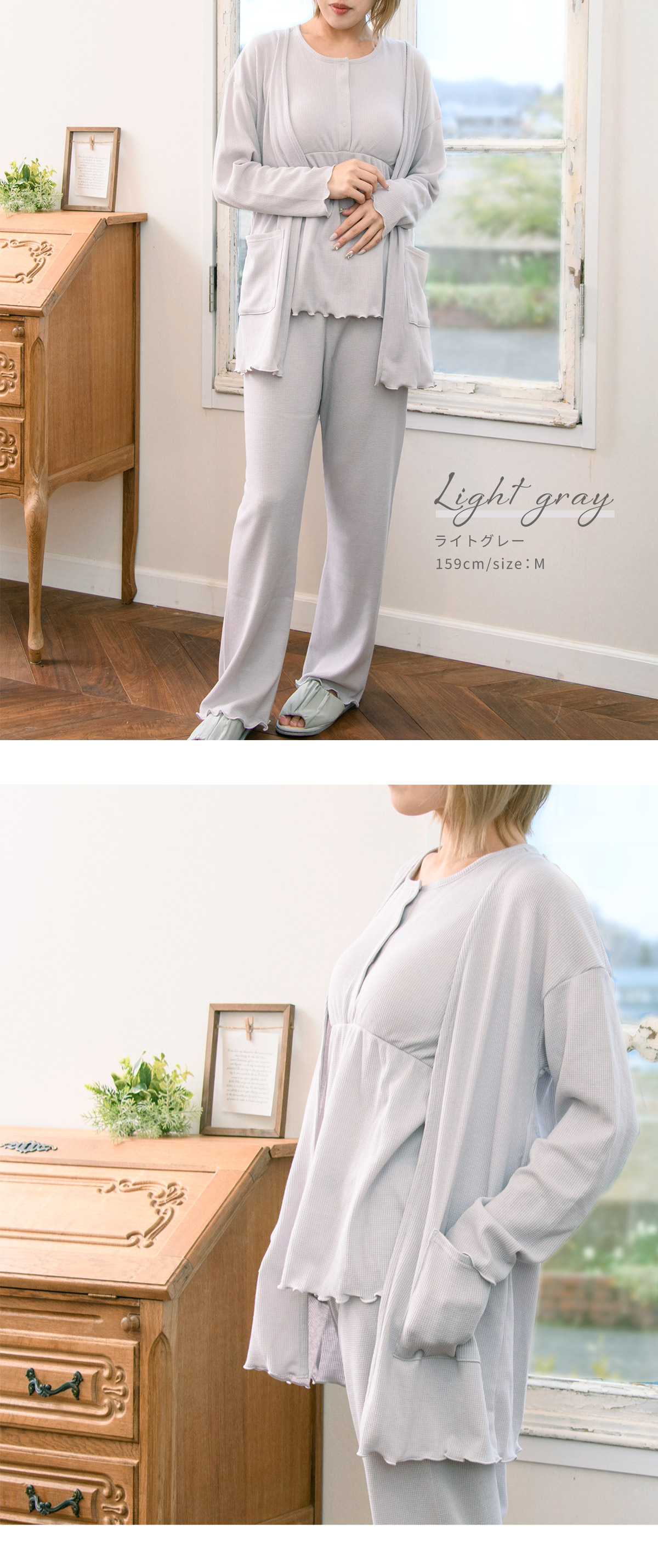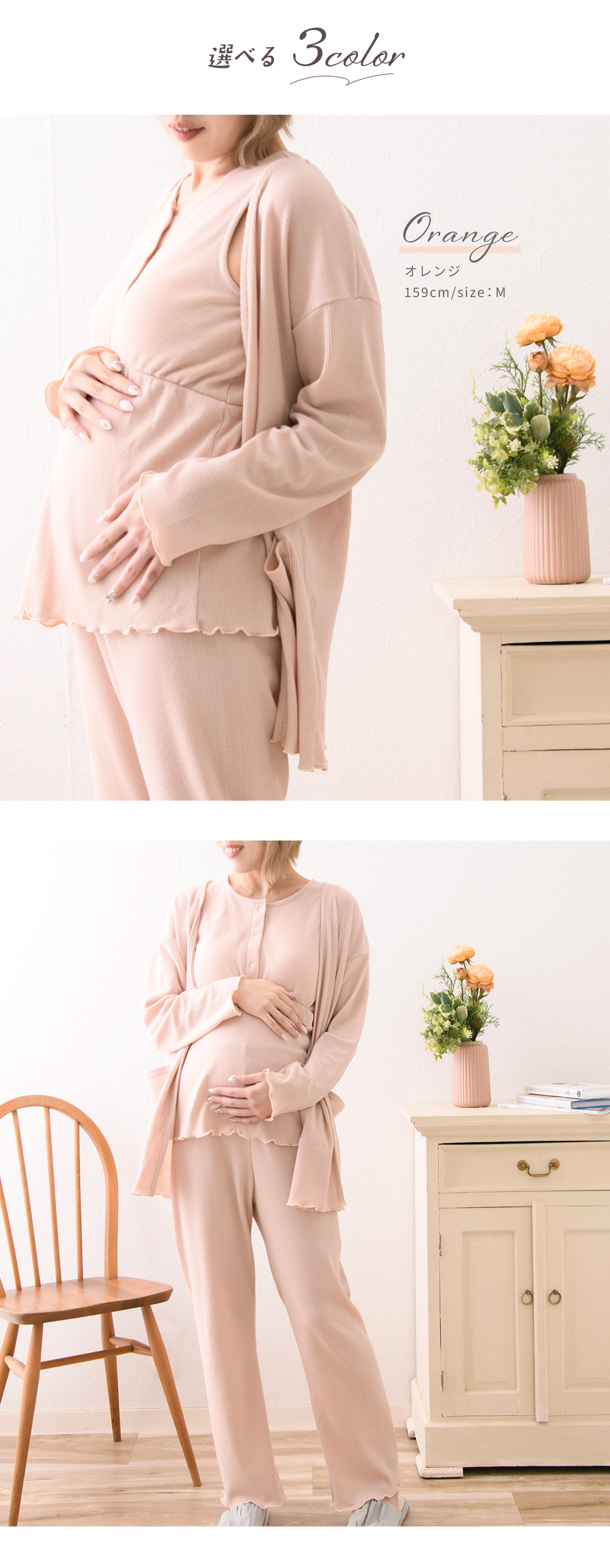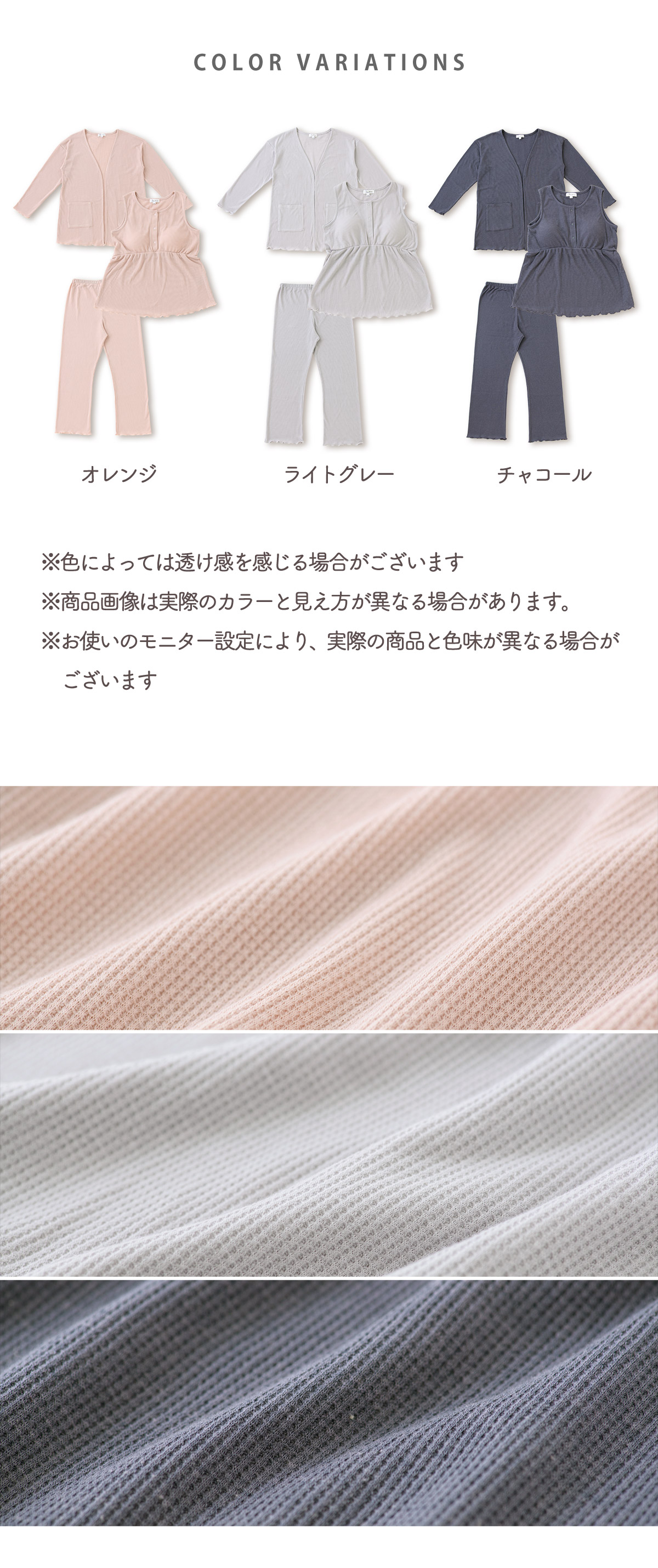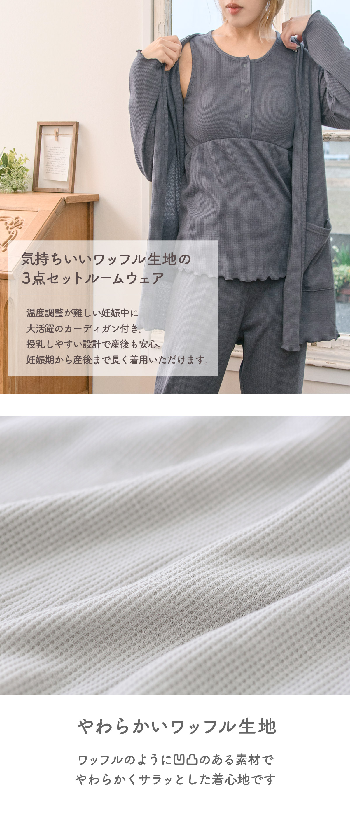 ■マタニティ パジャマ マタニティウェア ワッフル 3点セットルームウェア 春 夏 肌にやさしい 出産準備 産前産後 入院着 授乳可能 カーディガン タンクトップ ボトム 授乳服 妊婦 ママ 妊娠 上下セット ローズマダム レディース おしゃれ オレンジ グレー チャコール