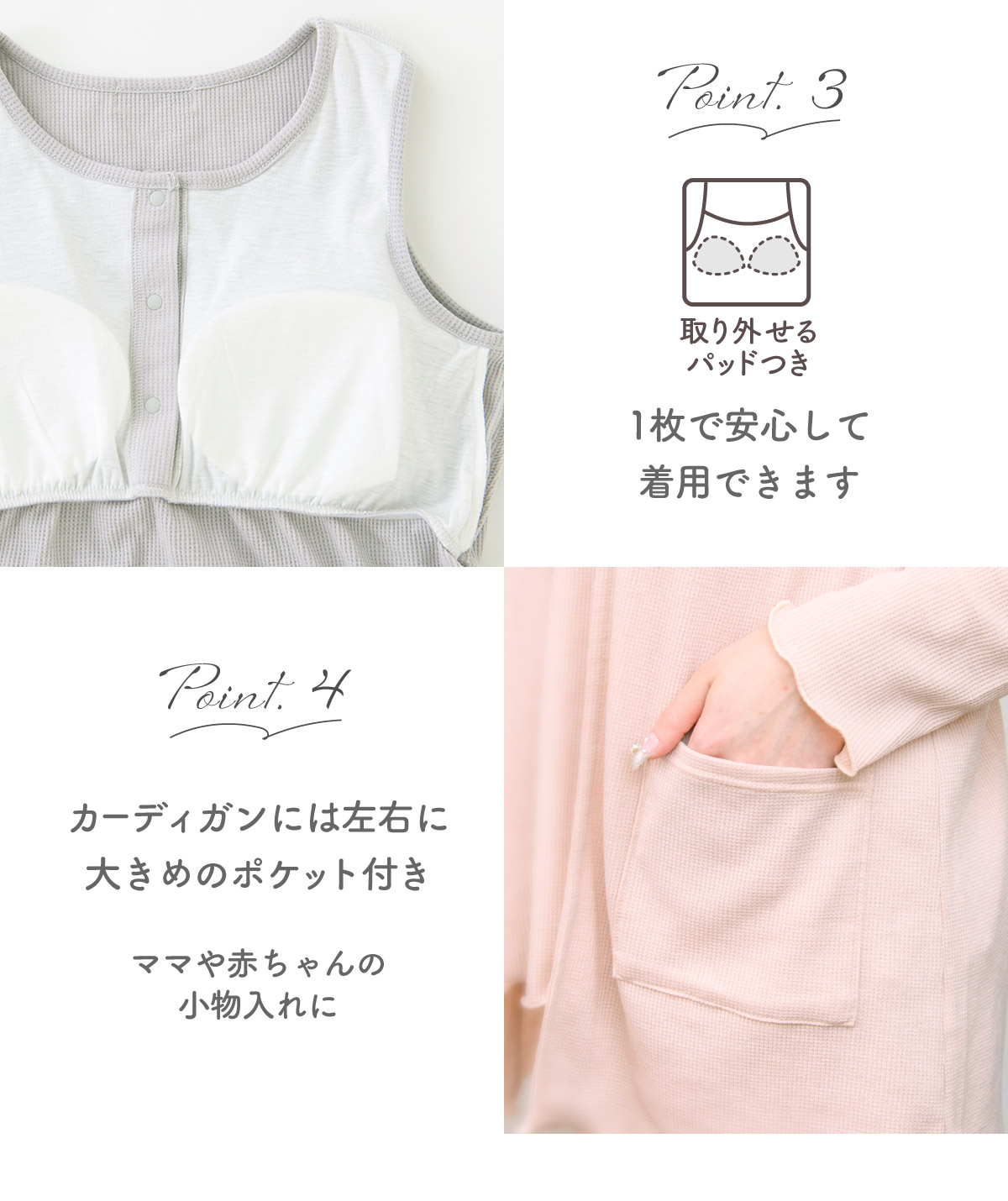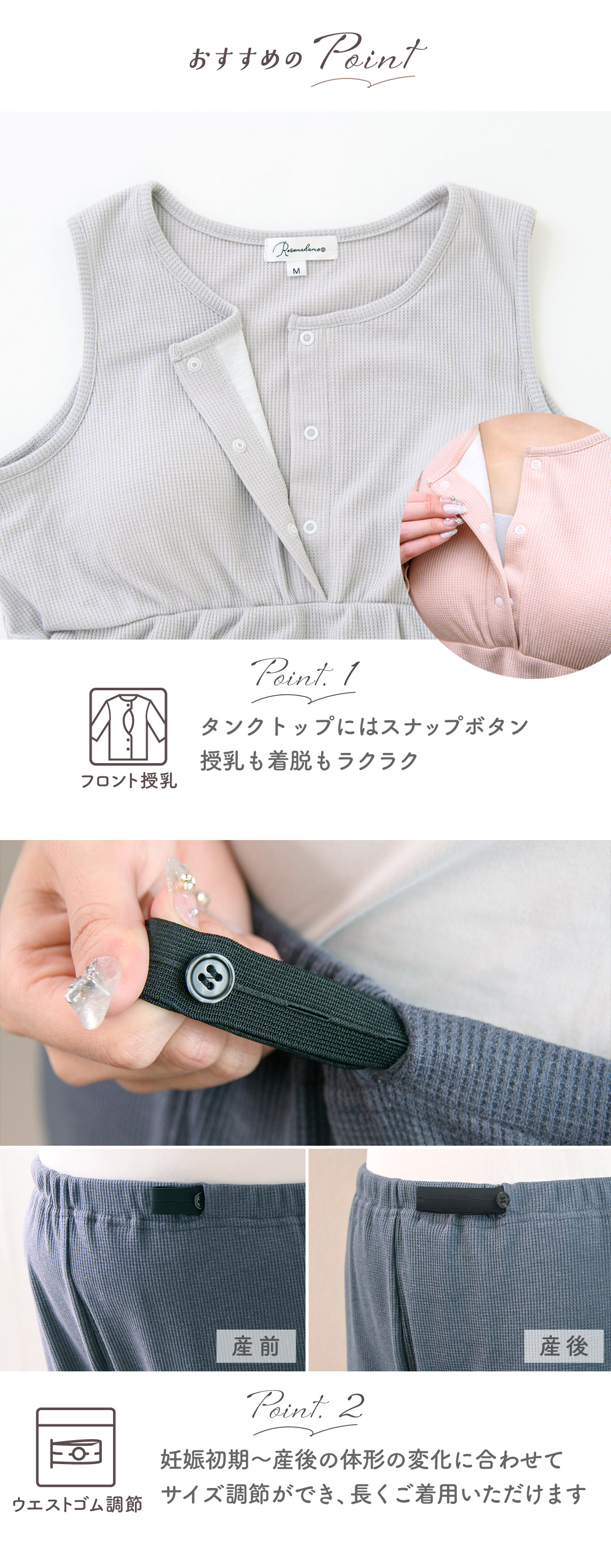 タンクトップは、前開きボタンで授乳がラクチン。取り外せるパッド付きです。