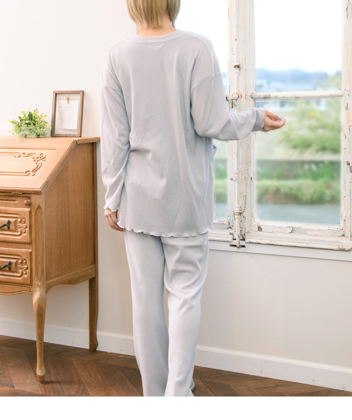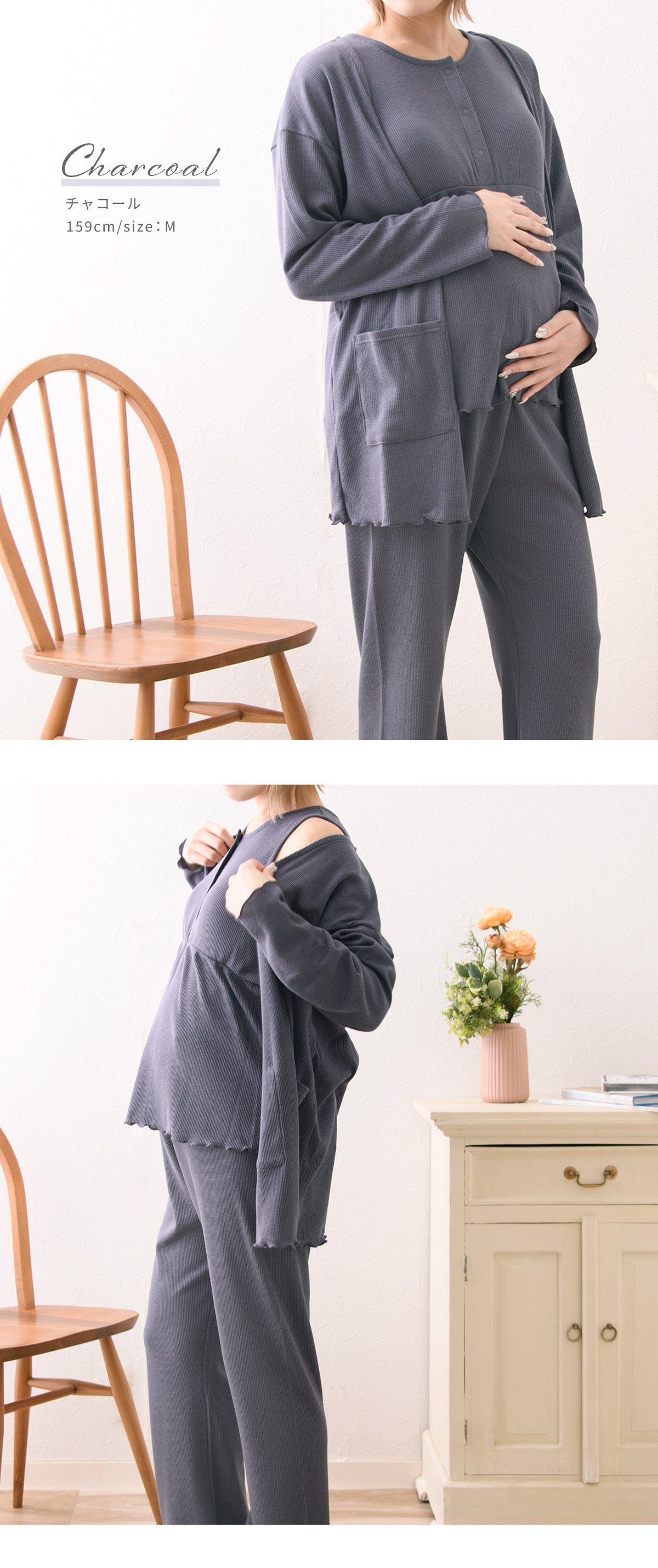 ボトムは、ウエスト調整ゴム付きで妊娠中・産後の体形変化に対応で産前から産後(授乳期)まで長く着られます。