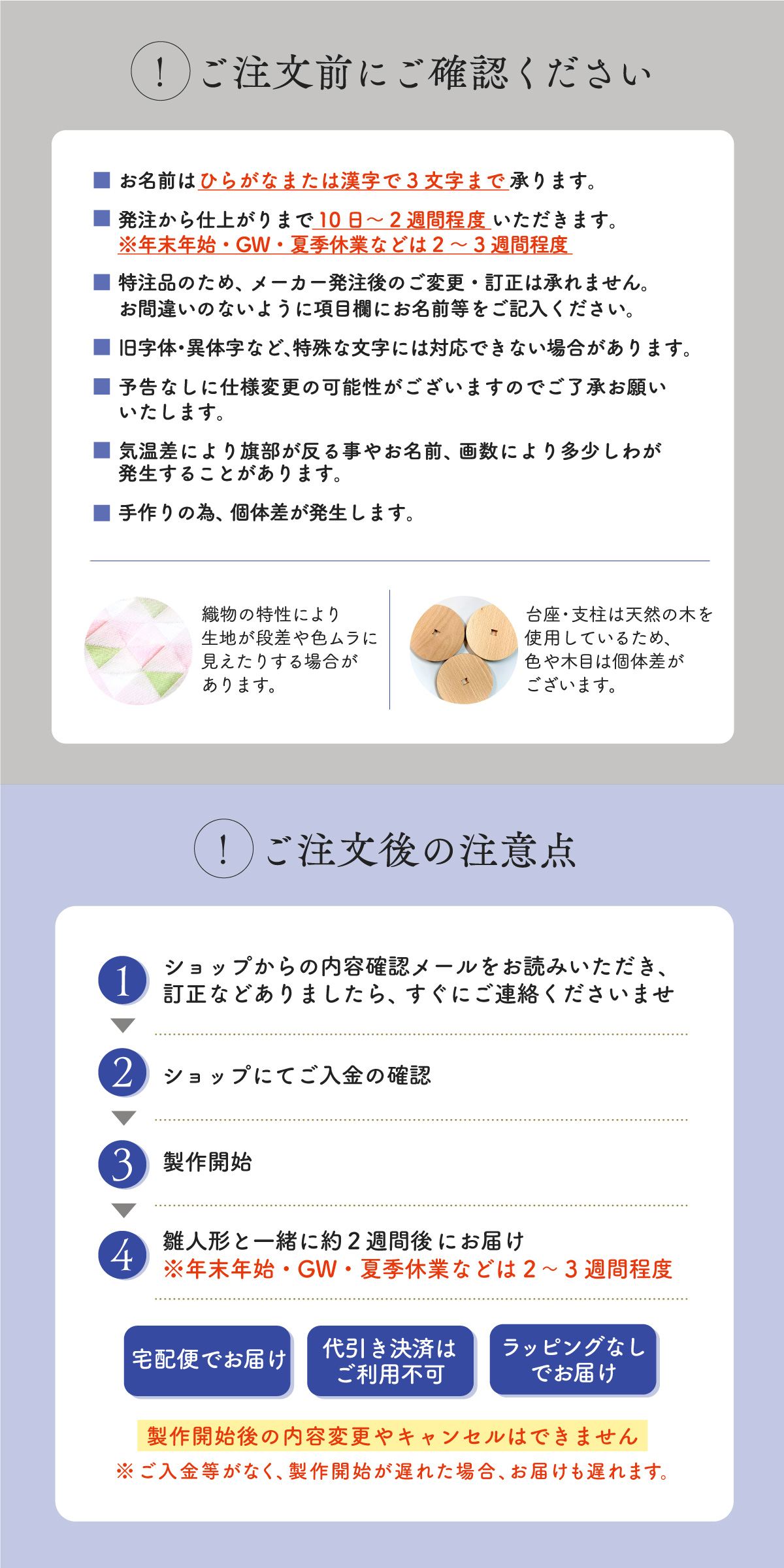 ※GW期間、夏季・年末年休業や祝日は製作もストップしますので、さらにお時間をいただきます。