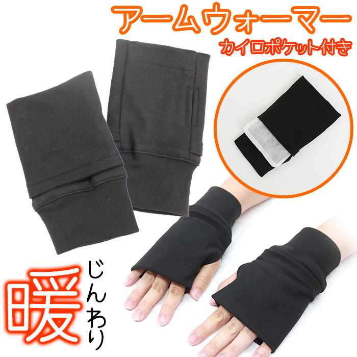 カイロポケット付きショート丈で親指穴(サムホール)付きで動きやすいアームウォーマー。