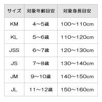 | KMサイズ:4-5歳 KLサイズ:5-6歳 JSSサイズ:6-7歳 JSサイズ:7-8歳 JMサイズ:9-10歳 JLサイズ:11-12歳 |
