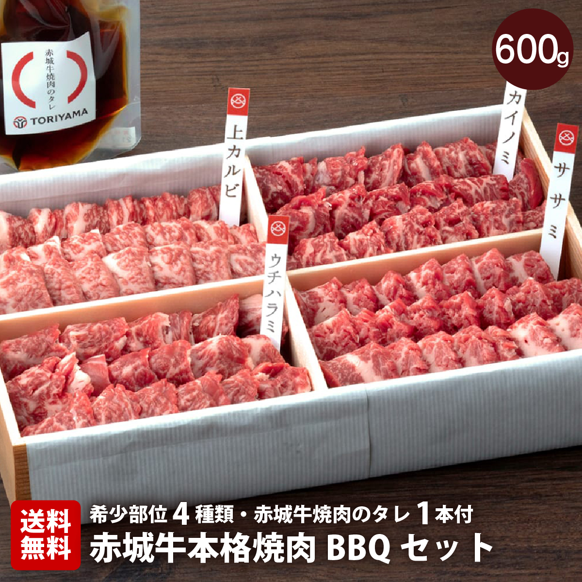 | 内容量 | 3〜4人前 赤城牛上カルビ(100g〜150g) 赤城牛カイノミ(100g〜150g) 赤城牛ササミ(100g〜150g) 赤城牛ウチハラミ(100g〜150g) |