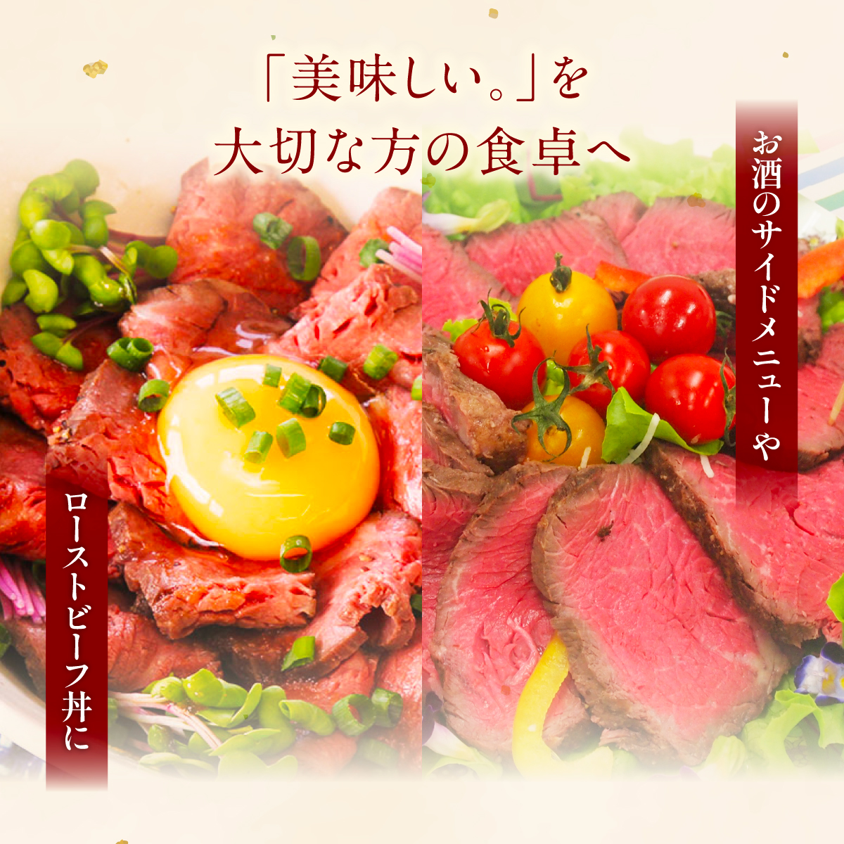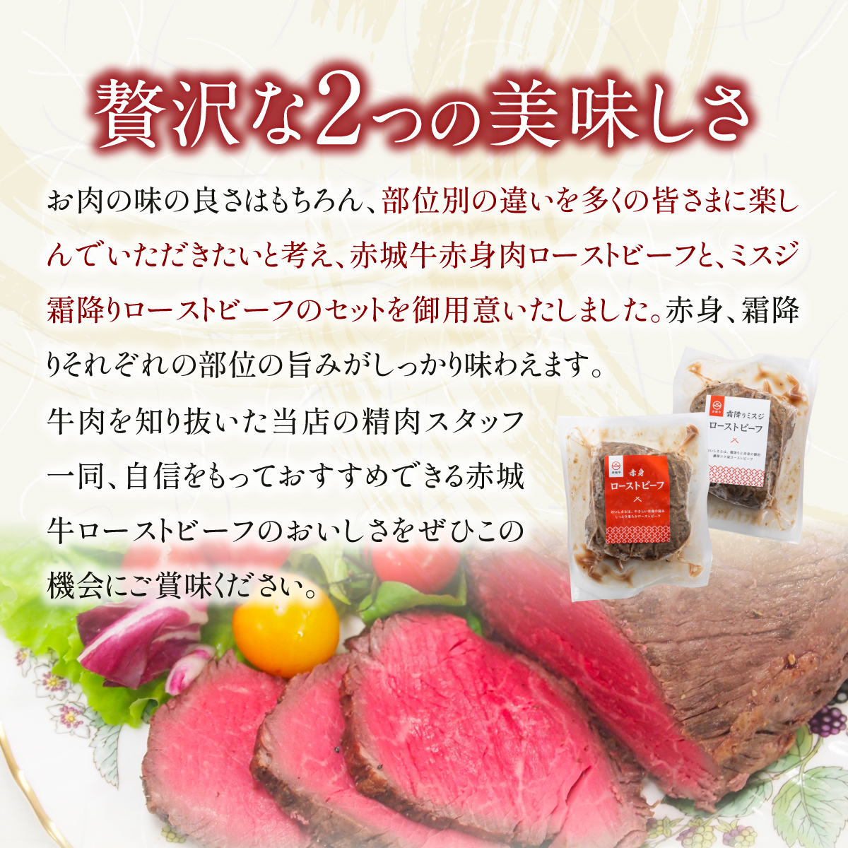 | 商品特徴 | ミスジ霜降りローストビーフ:牛の肩から腕にある部位です。1頭の牛からわずか3kgほどしか取れない希少部位です。脂の口どけ・濃厚な味わいを楽しめます。 赤身肉ローストビーフ:肉の旨みに大きくかかわっている、グルタミン酸や、イノシン酸が多く含まれる赤身部位のみを使用しております。 |