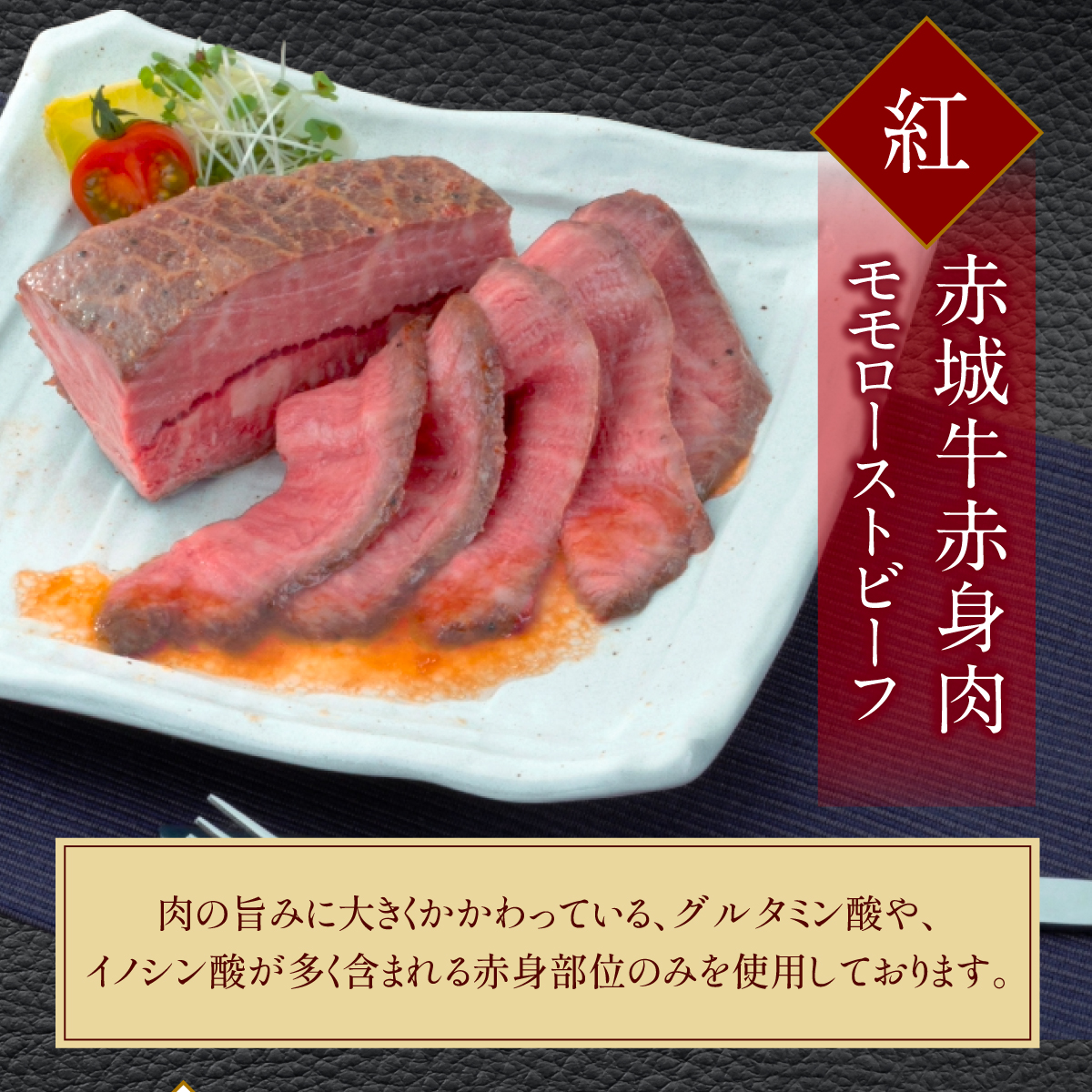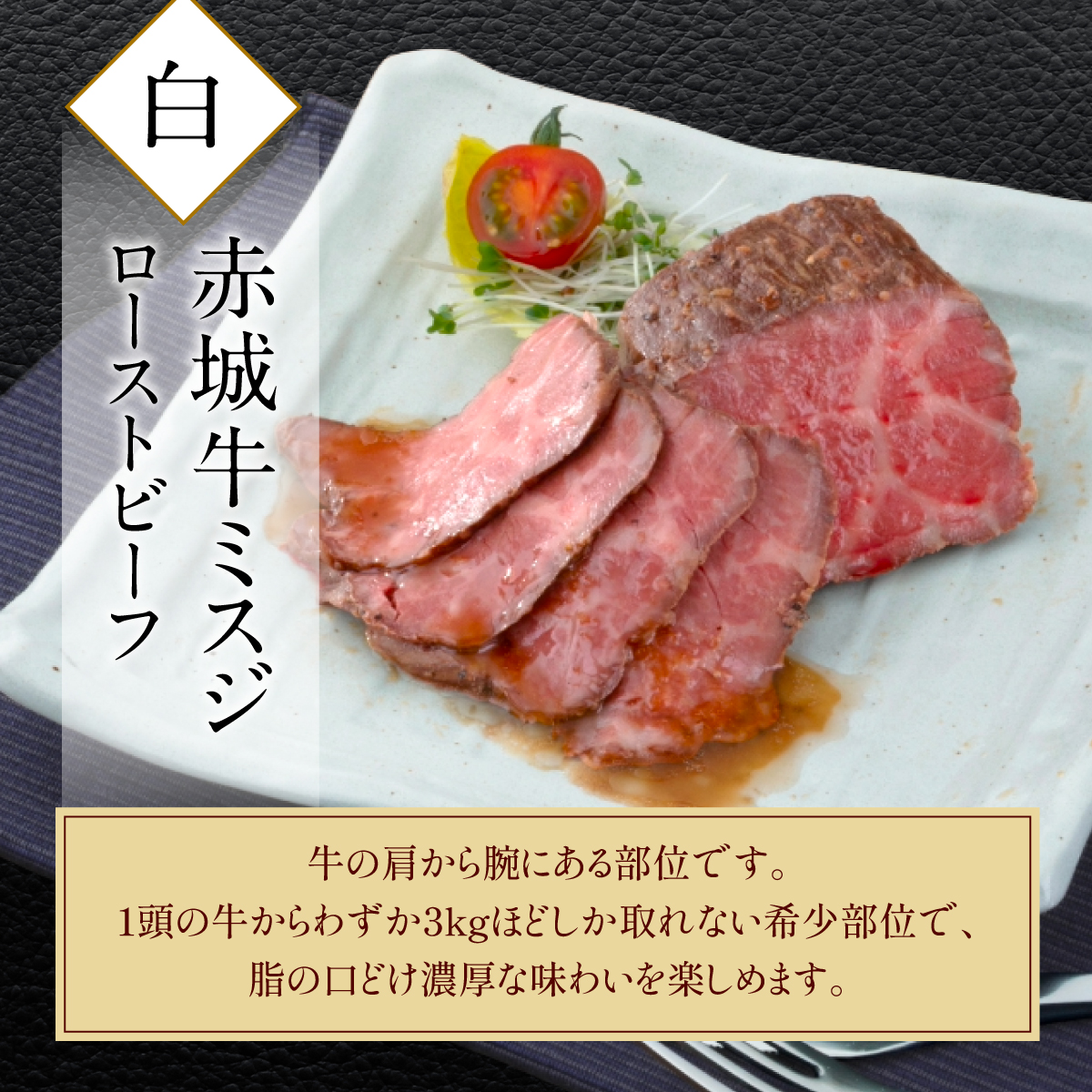 | 商品特徴 | 一定期間熟成させた赤城牛の赤身肉の優しい味と柔らかさ、ミスジの、しっとりと柔らかく、とろけるような甘みを引き立たせるため、塩・コショウで味付けし、じっくりとローストしました。素材の旨みを損なうことなく仕上げています。特性ソースとともに、また、ワサビ醤油などでお召し上がりください。 |