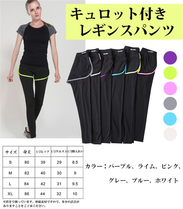| 商品特徴 | 体によくフィットする美シルエットレギンスパンツ。 ストレッチ抜群の履き心地♪締め付けないから気持ちよい♪ 吸水速乾素材でいつでもさわやかでドライ。快適にスポーツを楽しめます。 キュロットとレギンスが一体化しているので、面倒な重ね着が一切不要。 パンツのパイピングカラーがで、トップのコーディネイトを楽しめる。 なめらかな肌触りと伸縮性にとんだポリエステル素材を使用。 ショートパンツ付なので気になる部分をカバーでき、思い切り動けるのがうれしい。 幅広のウエストゴム仕様なので、安定感が抜群で、着脱も楽々です。 ●バイカラーパイピングがポイントになったカッコいいショートパンツ一体型スポーツレギンス★ ●レギンスとショーツが1つになっているので面倒な重ね着やコーデを考える必要一切ナシ! ●トップスさえあればすぐにトータルコーデが完成するスポーツウェアです◎ ●優秀なストレッチ性であらゆる動きにしなやかに順応!窮屈感もなく、心地よいフィット感を味わえます。 ●BLACK地に映えるWHITE、PURPLE、GLAY、BLUE、LIME、PINK、ORANGEの全7色のパイピング仕立て。 ●しっかり伸びるので幅広い体型の方にお使いいただけます。 ●何よりショートパンツ付きなのでヒップや太もも周りを気にすることなく思いっきり動けるのが嬉しいですね♪ | |