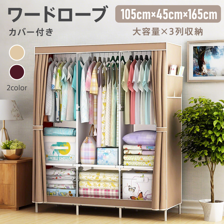ワードローブ おしゃれ クローゼット 3列 大容量 収納 カバー付き タンス ラック ハンガー 衣類収納 軽量 カーテン 組み立て式 新生活 ny238