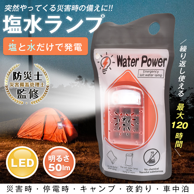 塩水ランプ ライト 防災 軽量 首掛け 自発電気 塩水袋 LED 電池不要 充電不要 屋外照明 海水発電 キャンプ アウトドア 災害 地震 停電 対策 防災士監修 od597