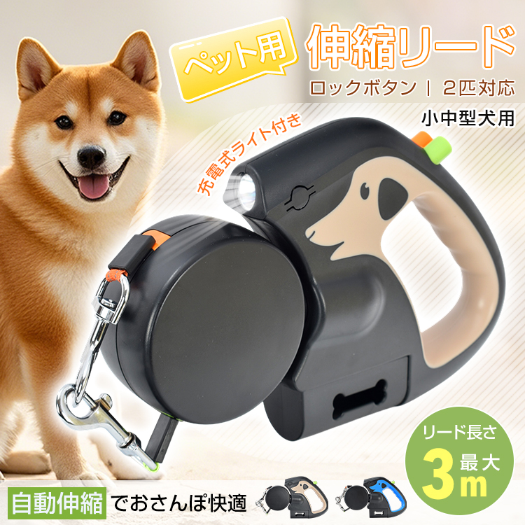 リード 犬 ペット用リード 伸縮リード 自動伸縮 小型犬用 中型犬用 2頭 2匹 多頭飼い 3m ライト付き ナイロン製 ロックボタン おしゃれ 持ちやすい ゴミ袋入れ